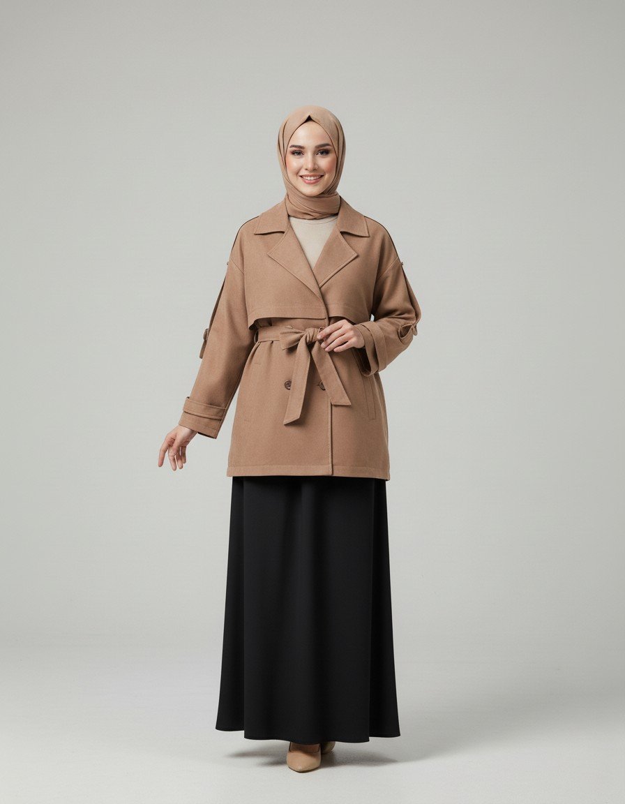 Aline Kapaklı Kol Ucu ve Omuz Kemer Detaylı Kısa Trenç-EN2199 Taba