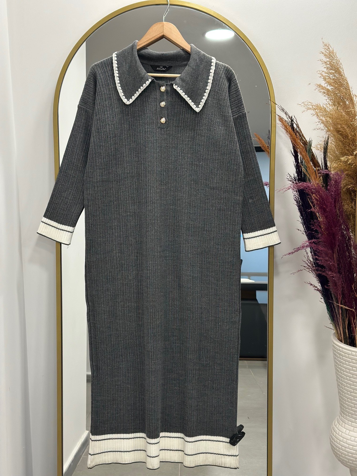 Alisa Bebe Yaka Üç Düğmeli Triko Elbise-KR3184 Antrasit
