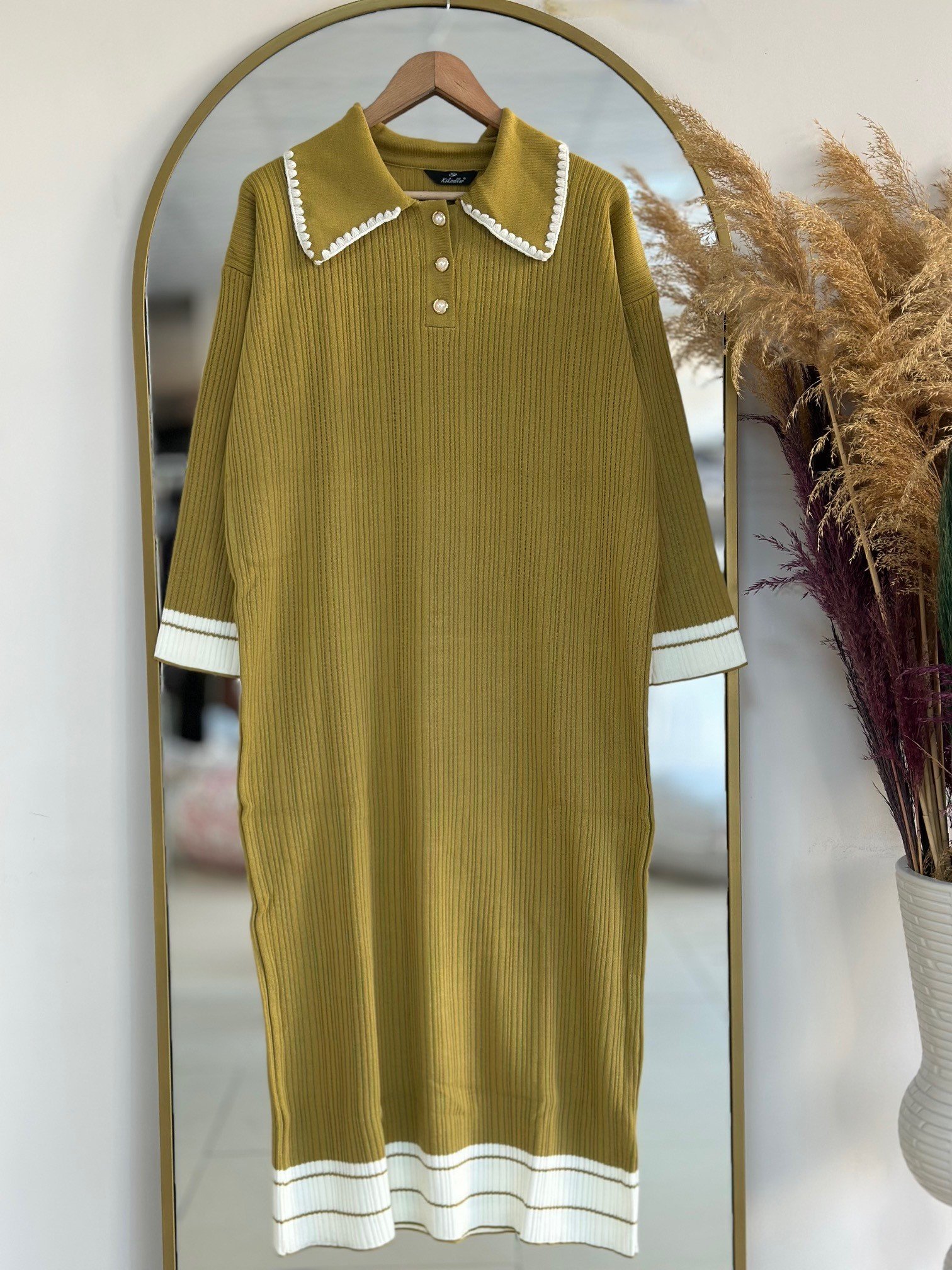 Alisa Bebe Yaka Üç Düğmeli Triko Elbise-KR3184 Yağ Yeşili