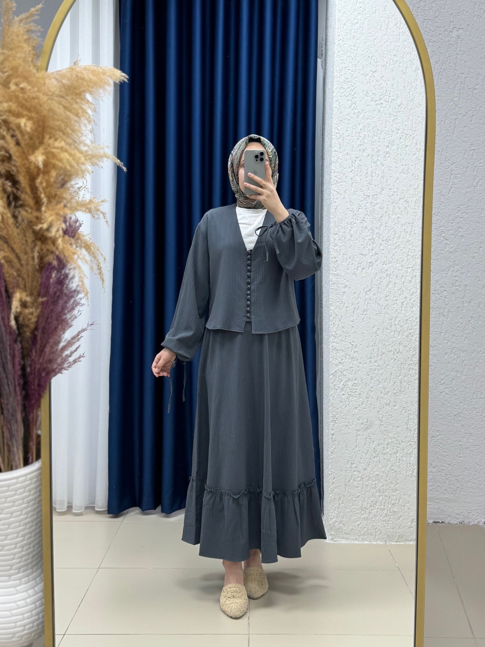 Ascona Kol Bağcıklı Boydan Düğmeli Etek Fırfırlı Dubai Takım-EK459 Antrasit
