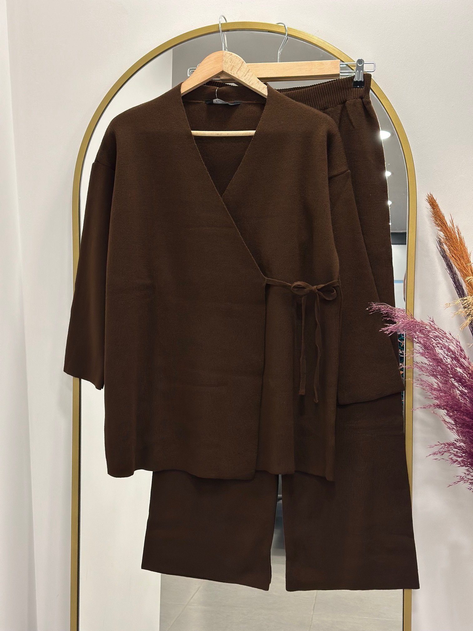 Asena Yanı Ve Önü Bağcıklı Hırkalı Pantolonlu Takım-KR3182 Kahve