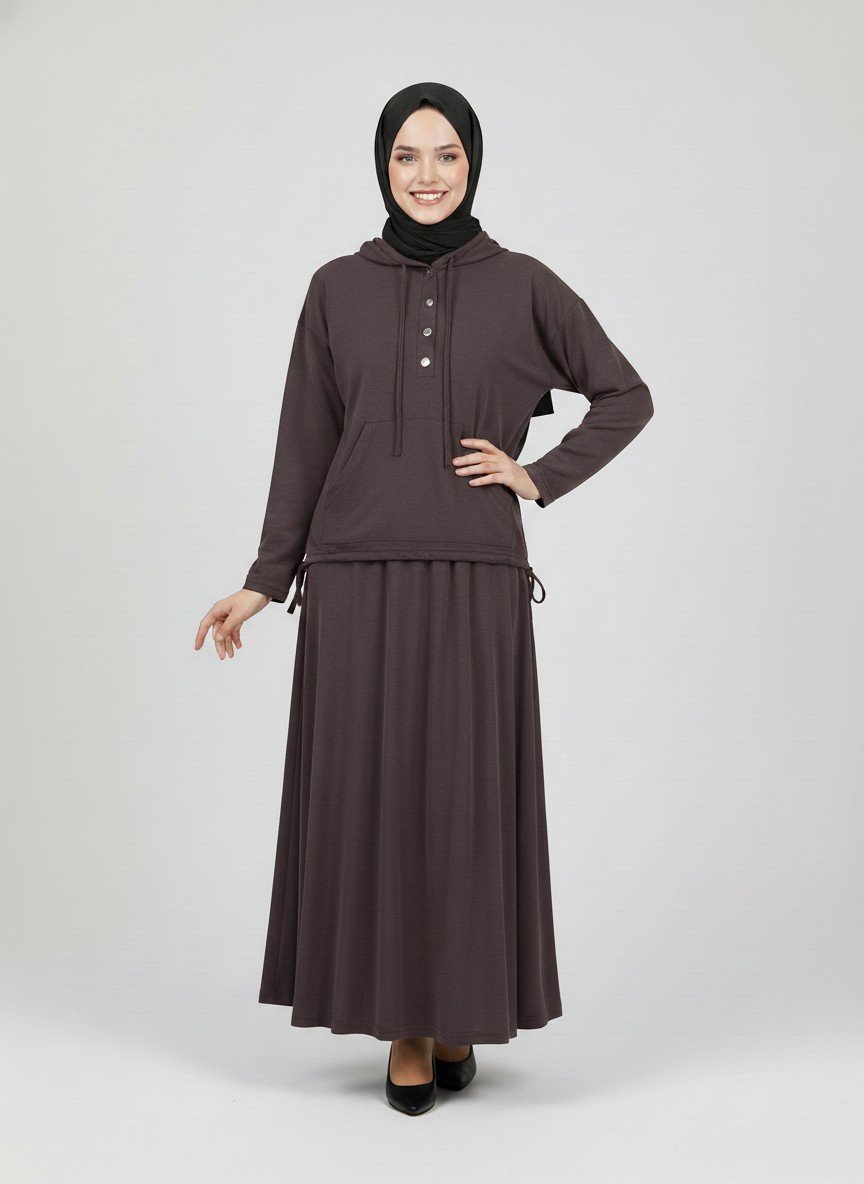 Barina Pat Detaylı Kangru Cepli Etekli Takım-AS084 Kahve