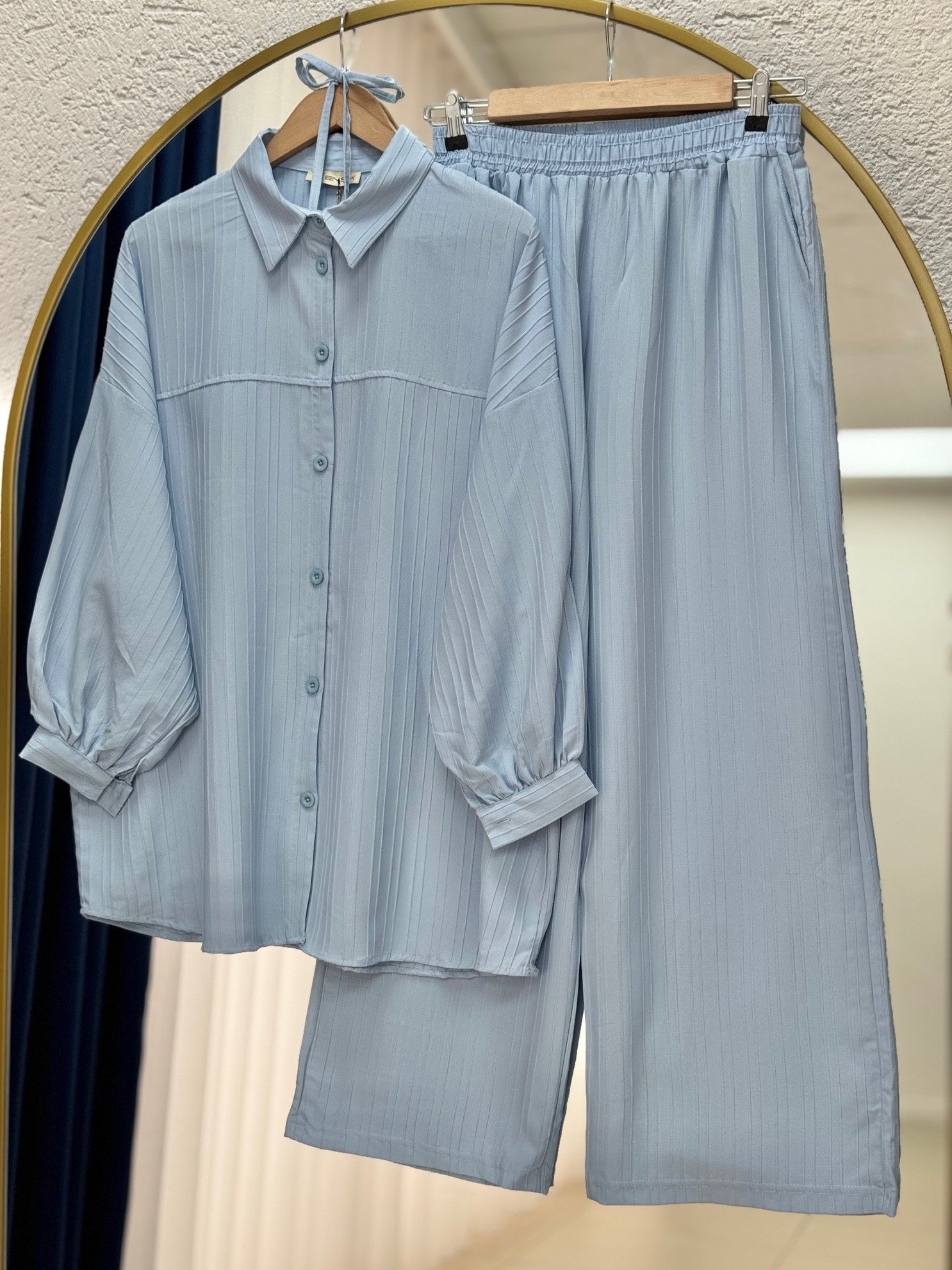 Behin Gömlek Önü Pervazlı Biyelii Dubai Pantolonlu Takım-EK-Z-480 Mavi