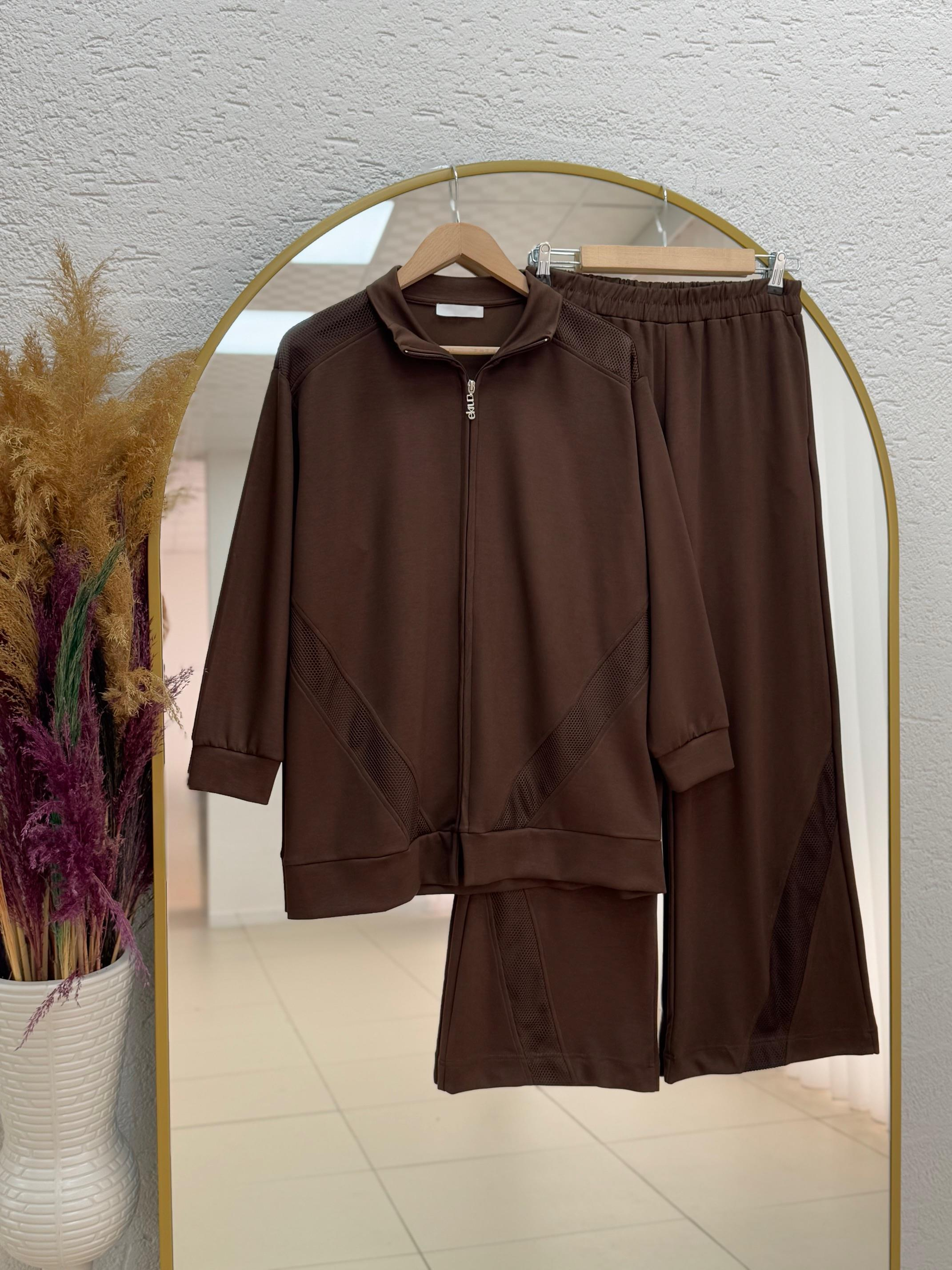 Beminda File Detaylı Fermuarlı Pantolonlu Takım-EU3080 Kahve