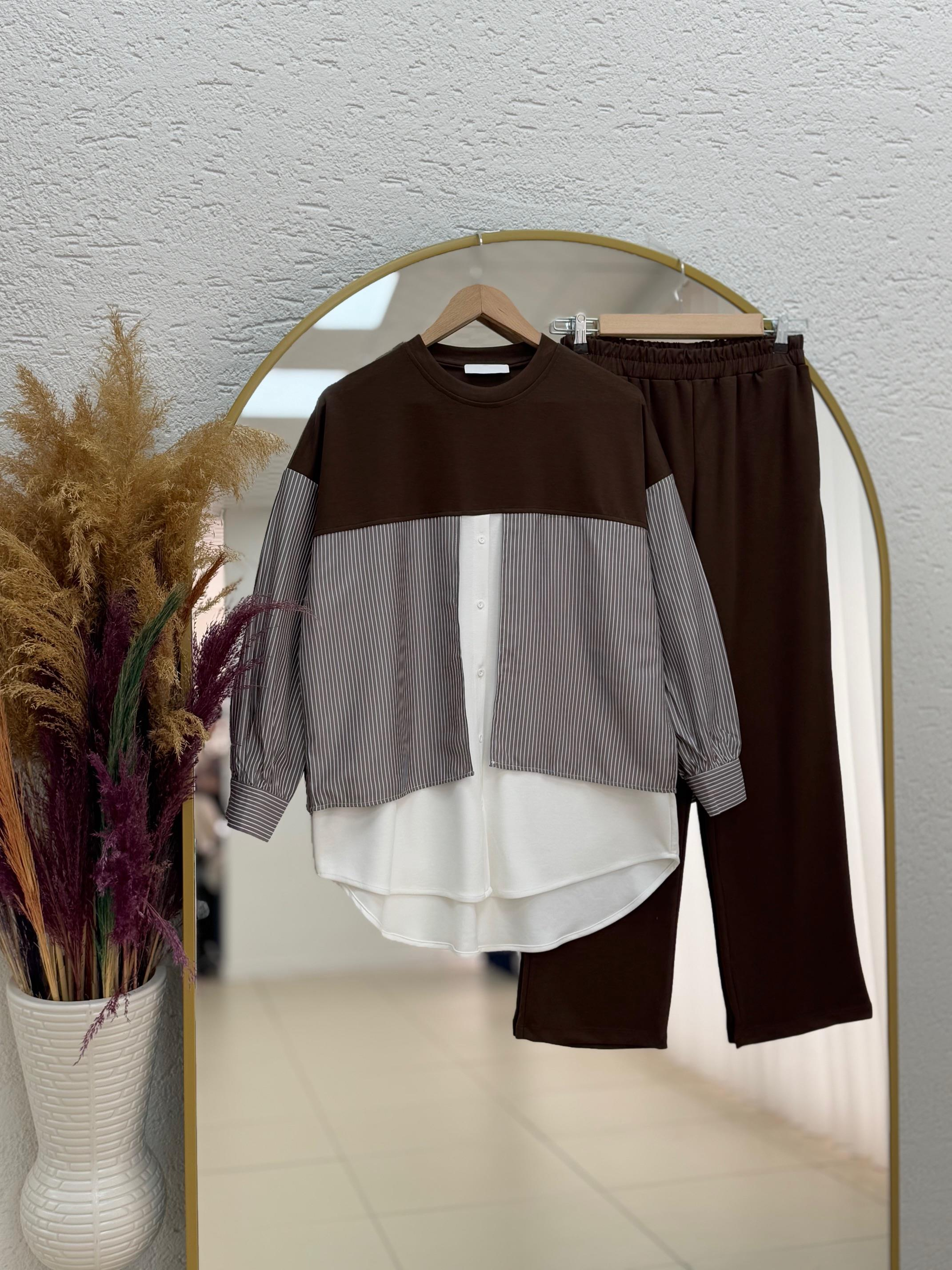 Bemique Bolerolu Garni Detay Pantolonlu Takım-EU3079 Kahve