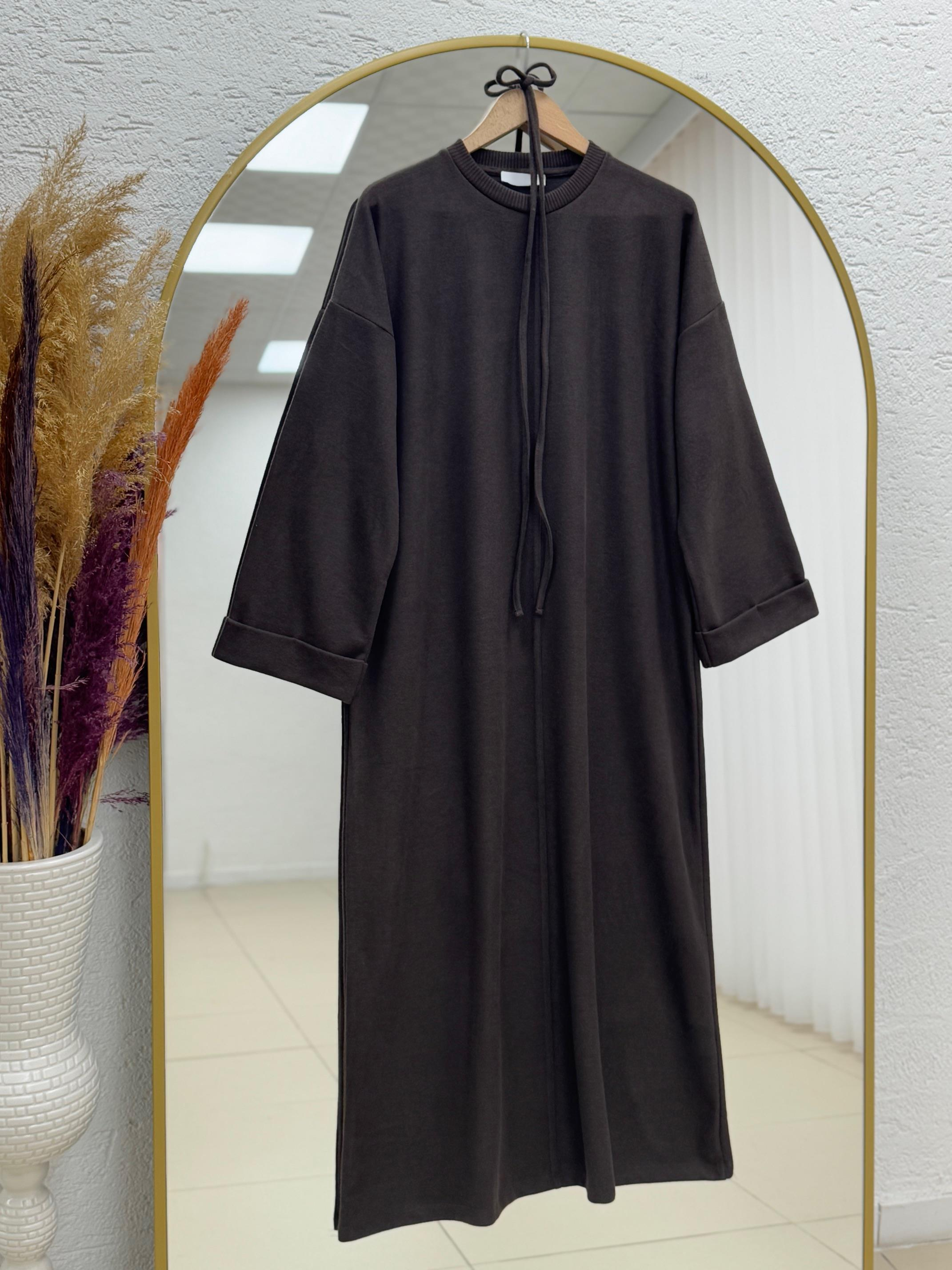 Bemisa Dikiş Detaylı Kuşaklı Dokulu Elbise-EU3108 Kahve