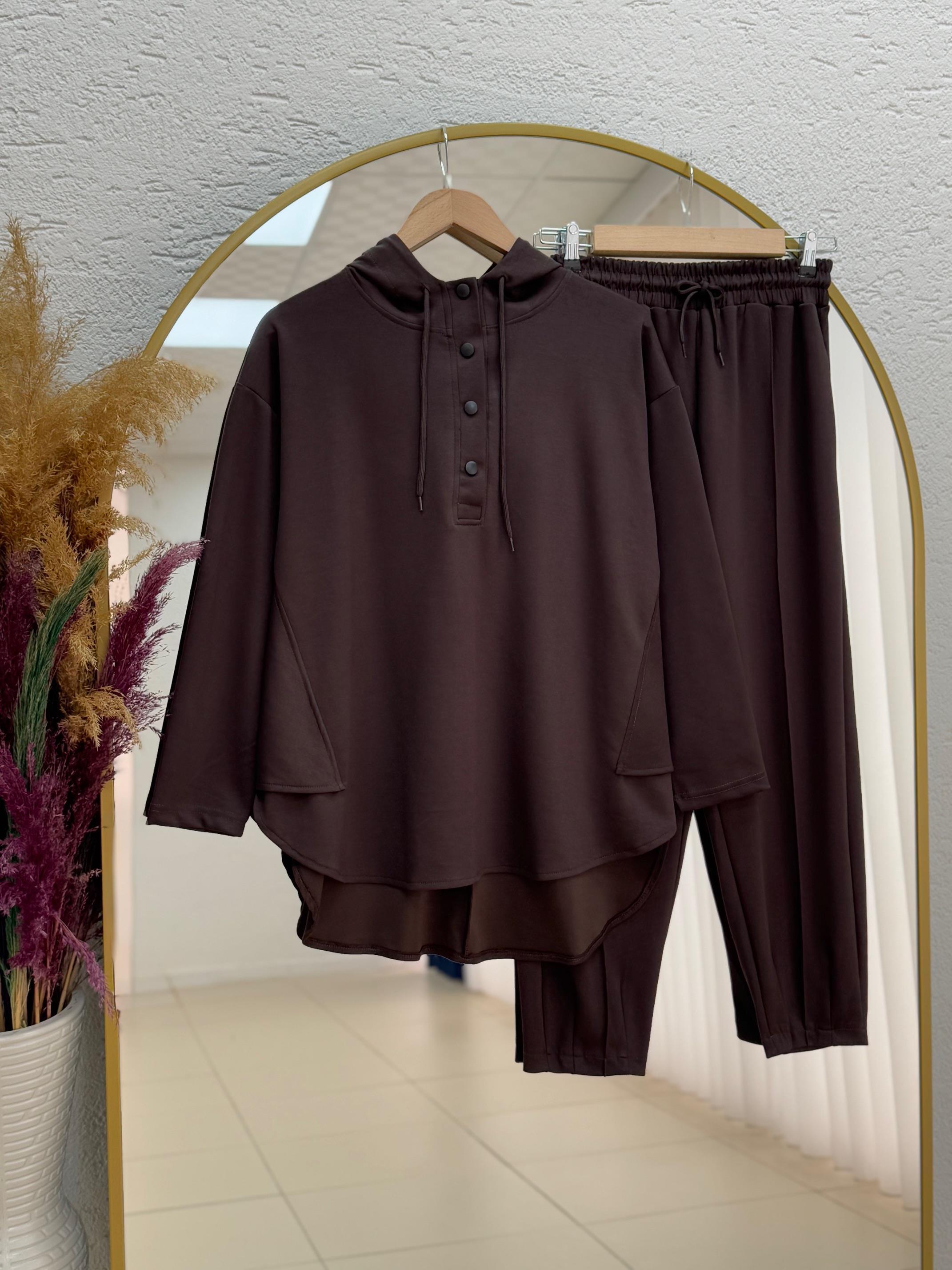 Bemista Kapşonlu Çıtçıtlı Yanı Yırtmaçlı Pantolonlu Takım-MA8329 Kahve