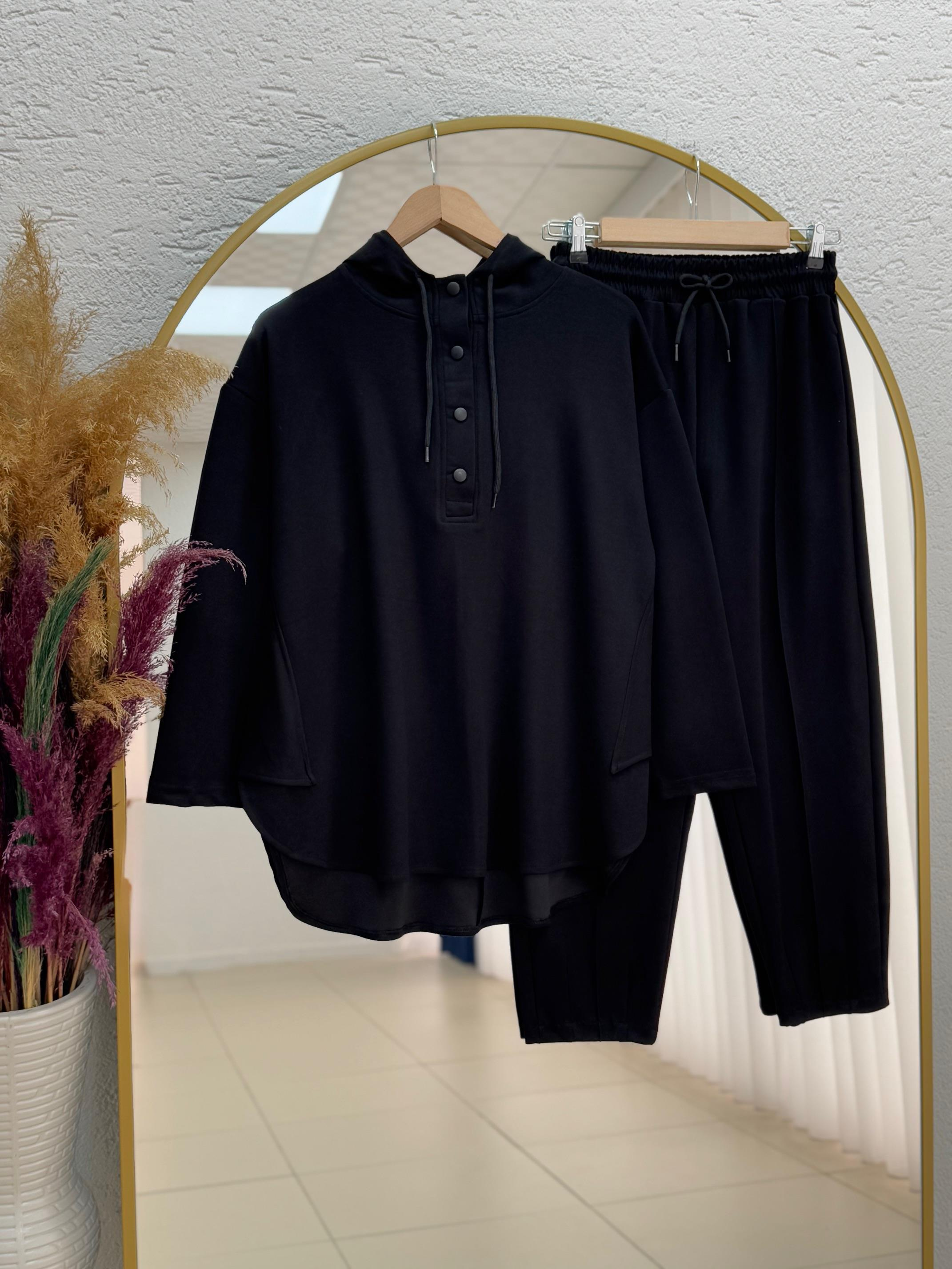 Bemista Kapşonlu Çıtçıtlı Yanı Yırtmaçlı Pantolonlu Takım-MA8329 Siyah