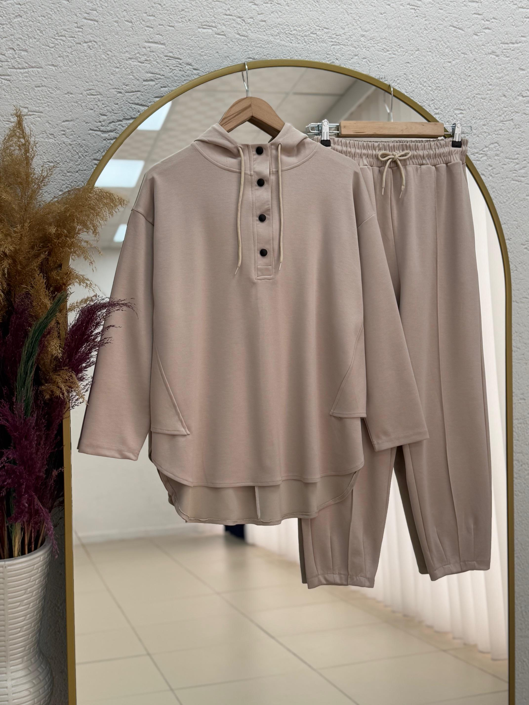 Bemista Kapşonlu Çıtçıtlı Yanı Yırtmaçlı Pantolonlu Takım-MA8329 Taş