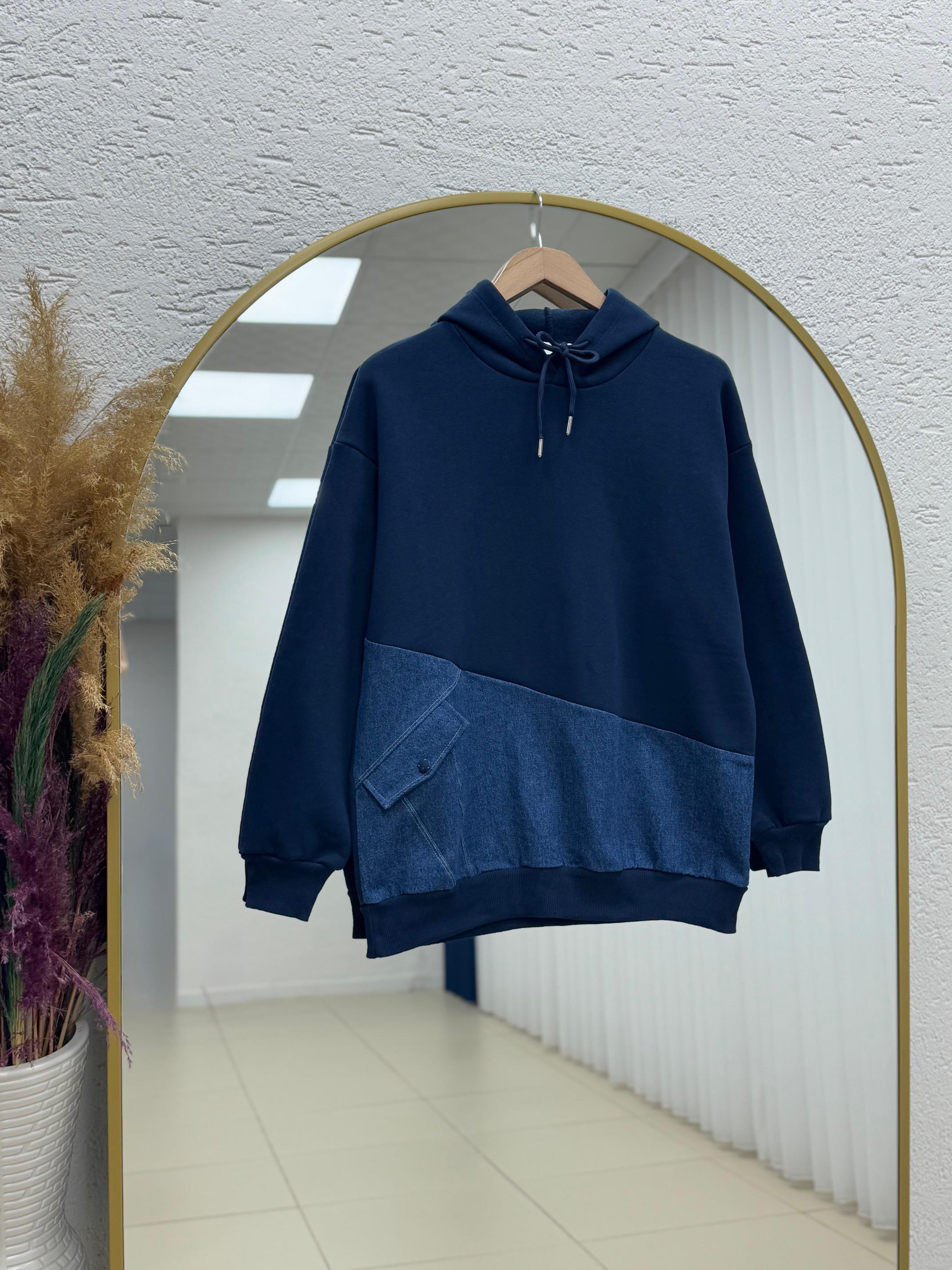 Bemoria Kot Detaylı Gizli Cepli Kapşonlu Üç İp Sweat-ZN1123 Lacivert