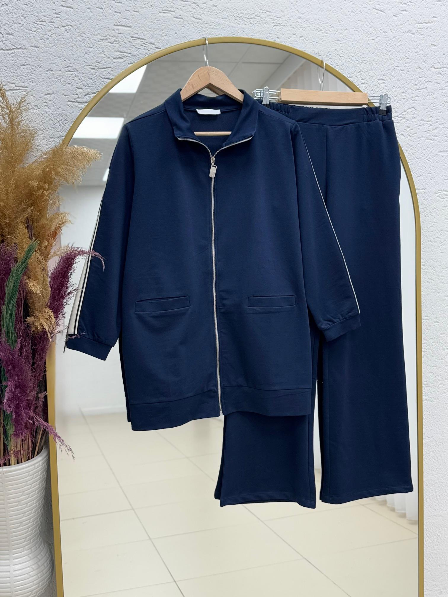Bemyla Balıkçı Yaka Fermuarlı Şeritli Pantolonlu Takım-EU3048 Lacivert