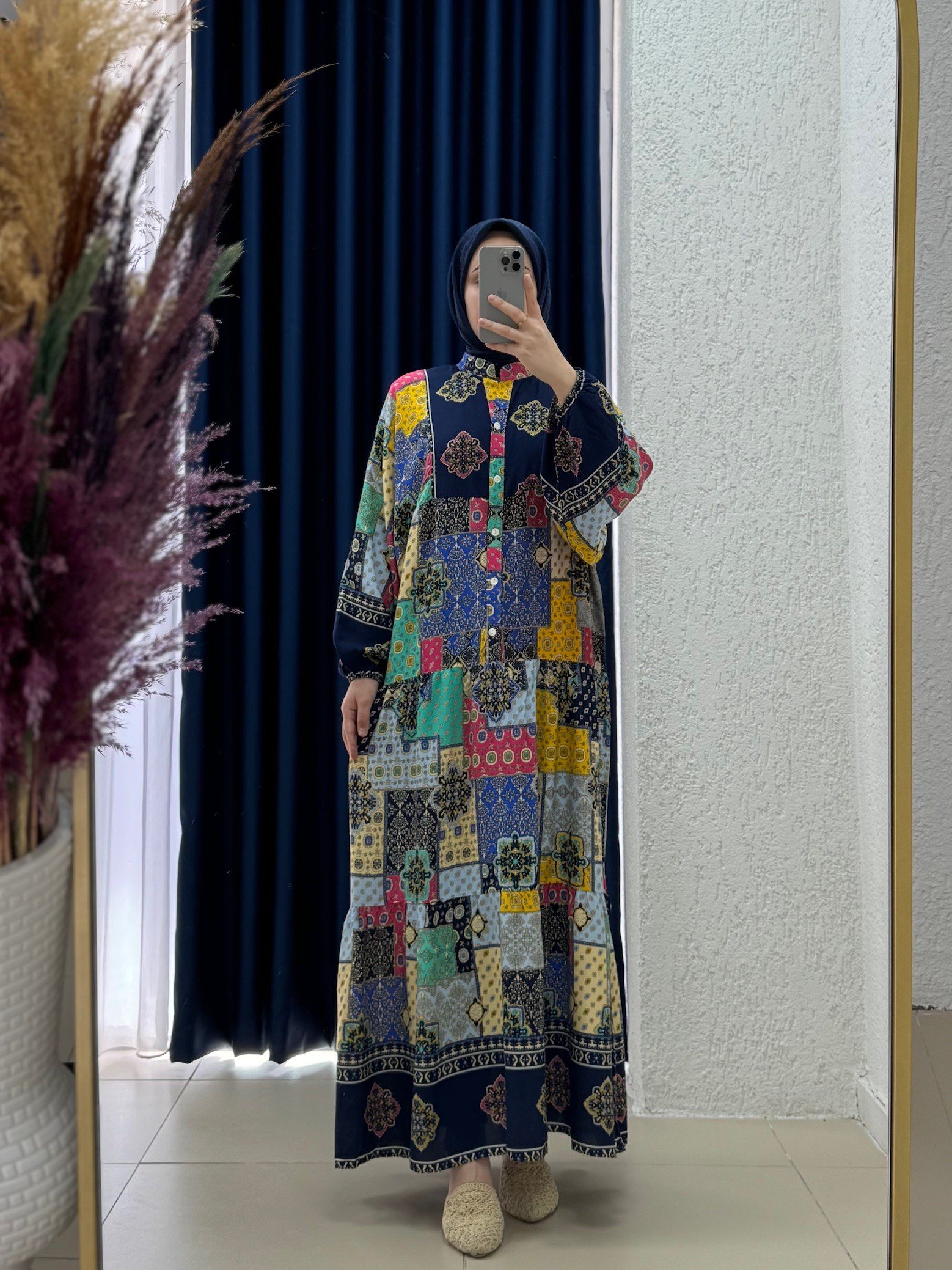 Bergamo Etnik Desen Elbise-PE606 Lacivert