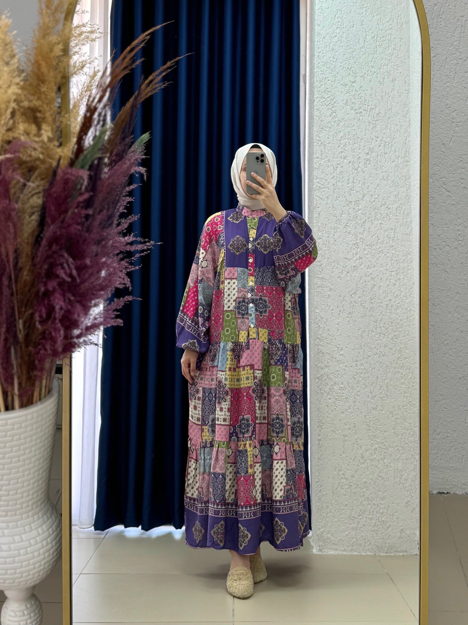 Bergamo Etnik Desen Elbise-PE606 Lila