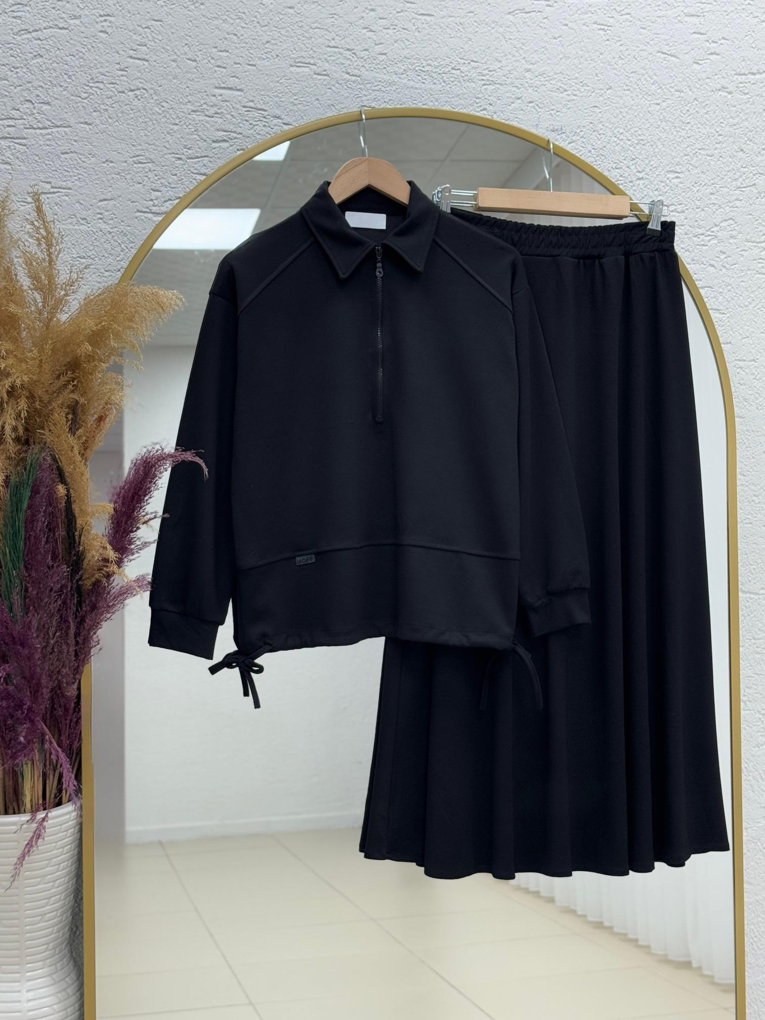 Caminda Yarım Fermuarlı Yandan Bağcıklı Etekli Takım-MF1820 Siyah