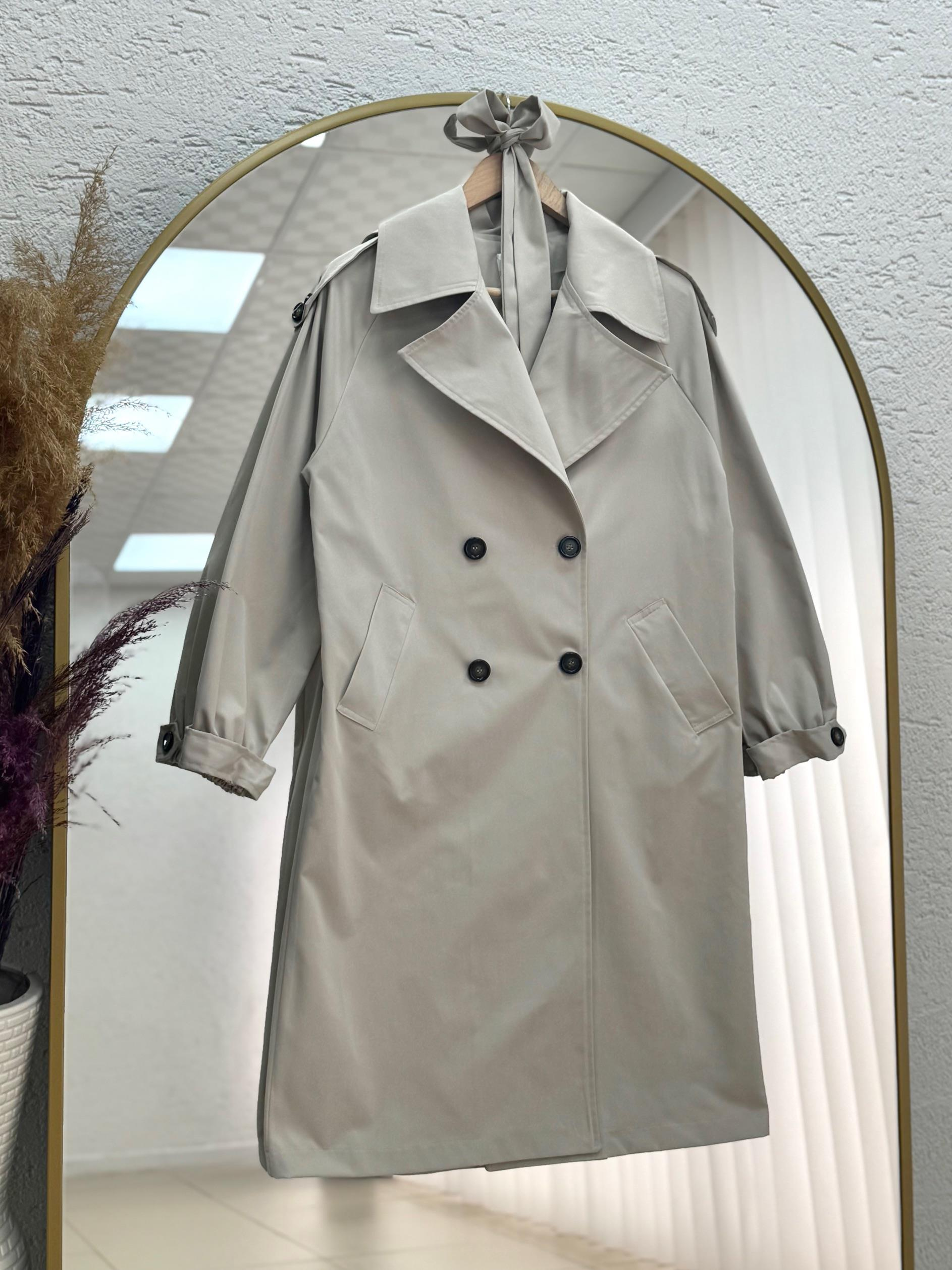 Camique Kol Ucu Lastikli ve Kemerli Çift Cepli Trençkot-KT1235 Taş
