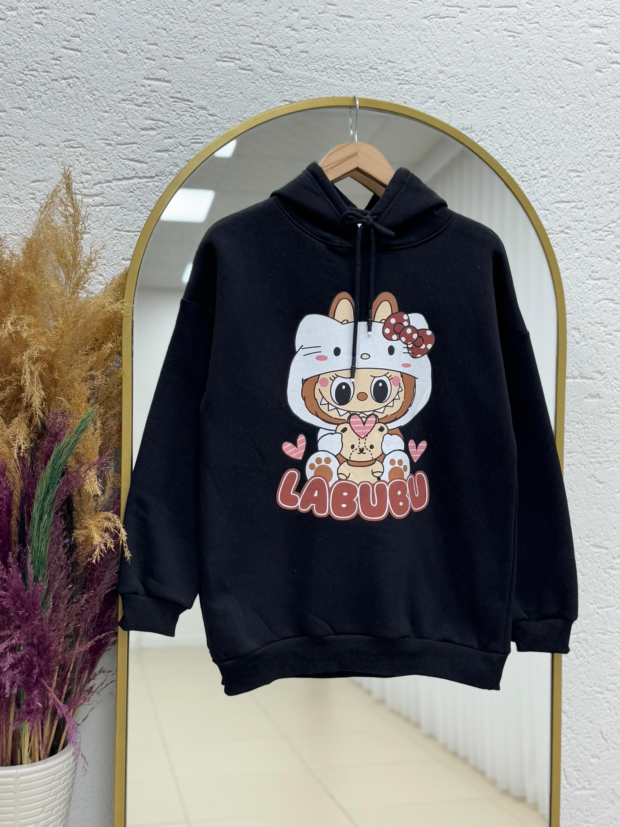 Camoria Labubu Baskılı Üç İp Kapşonlu Sweat-CI4104 Siyah