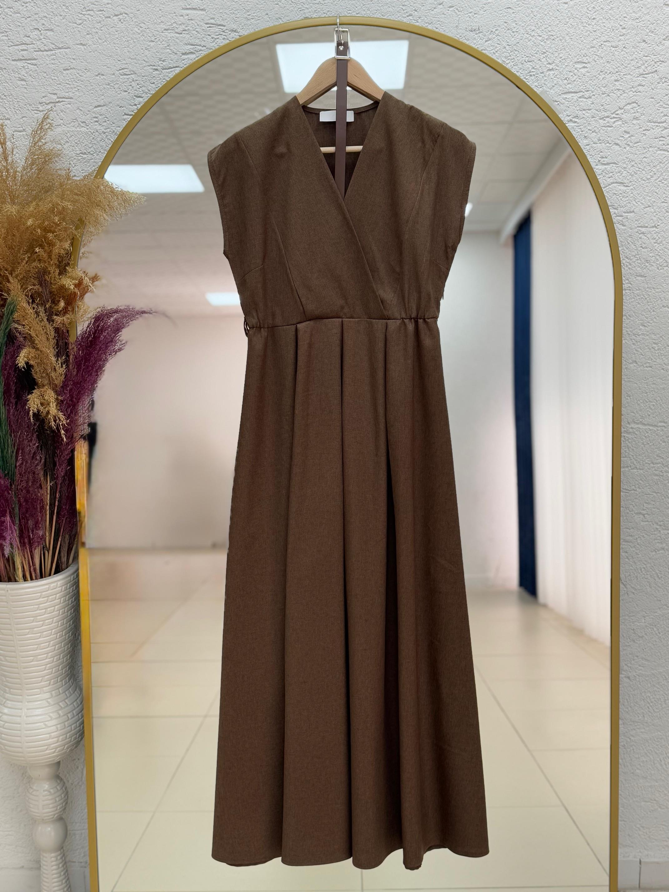 Capera Eteği Pileli Kemerli Jile Elbise-EK530 Kahve