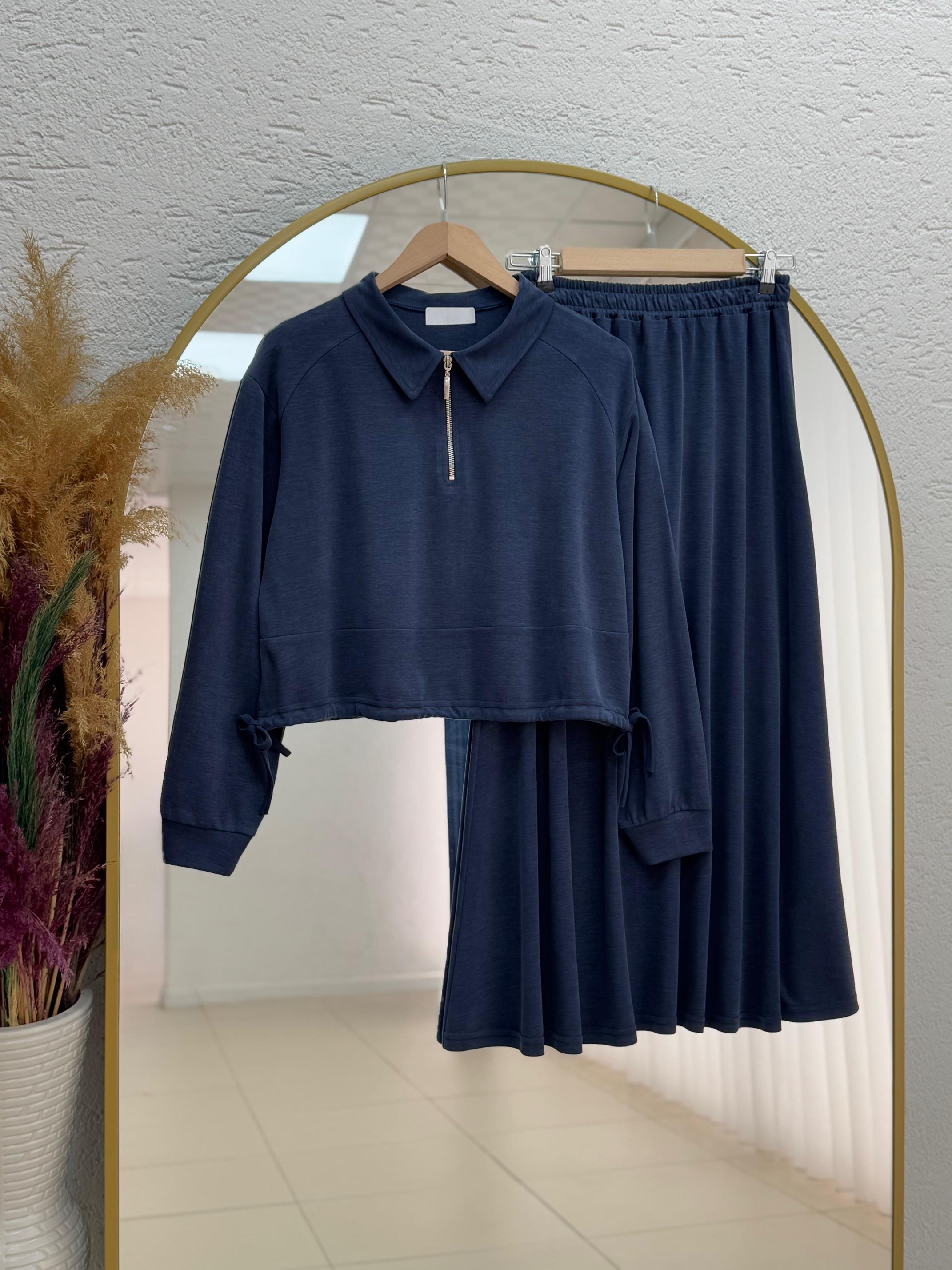 Capina Yarım Fermuarlı Yanları Sıkmalı Pike Kumaş Etekli Takım-AS085 Lacivert