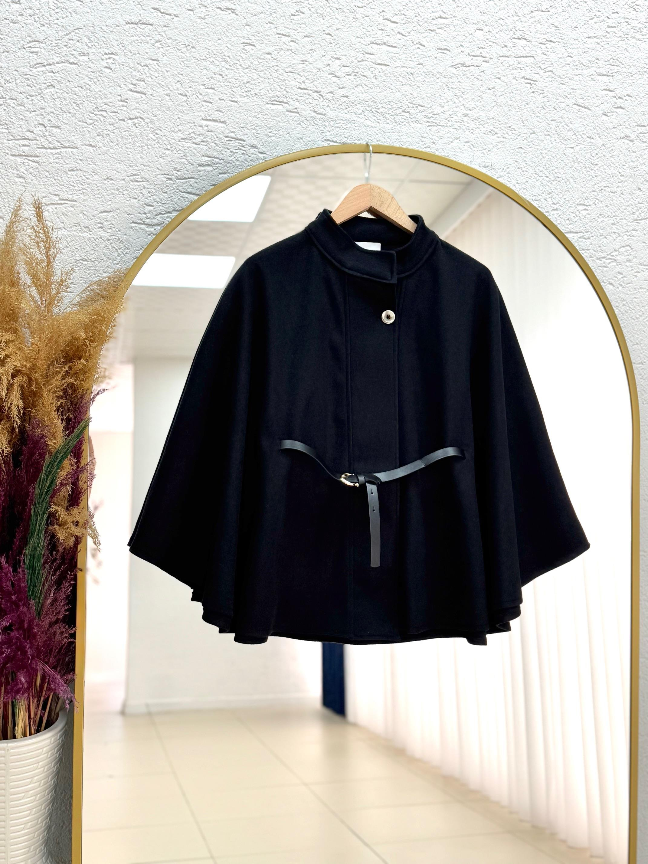 Capique Tek Düğmeli Kemerli Kaşe Panço-Çİ457 Siyah