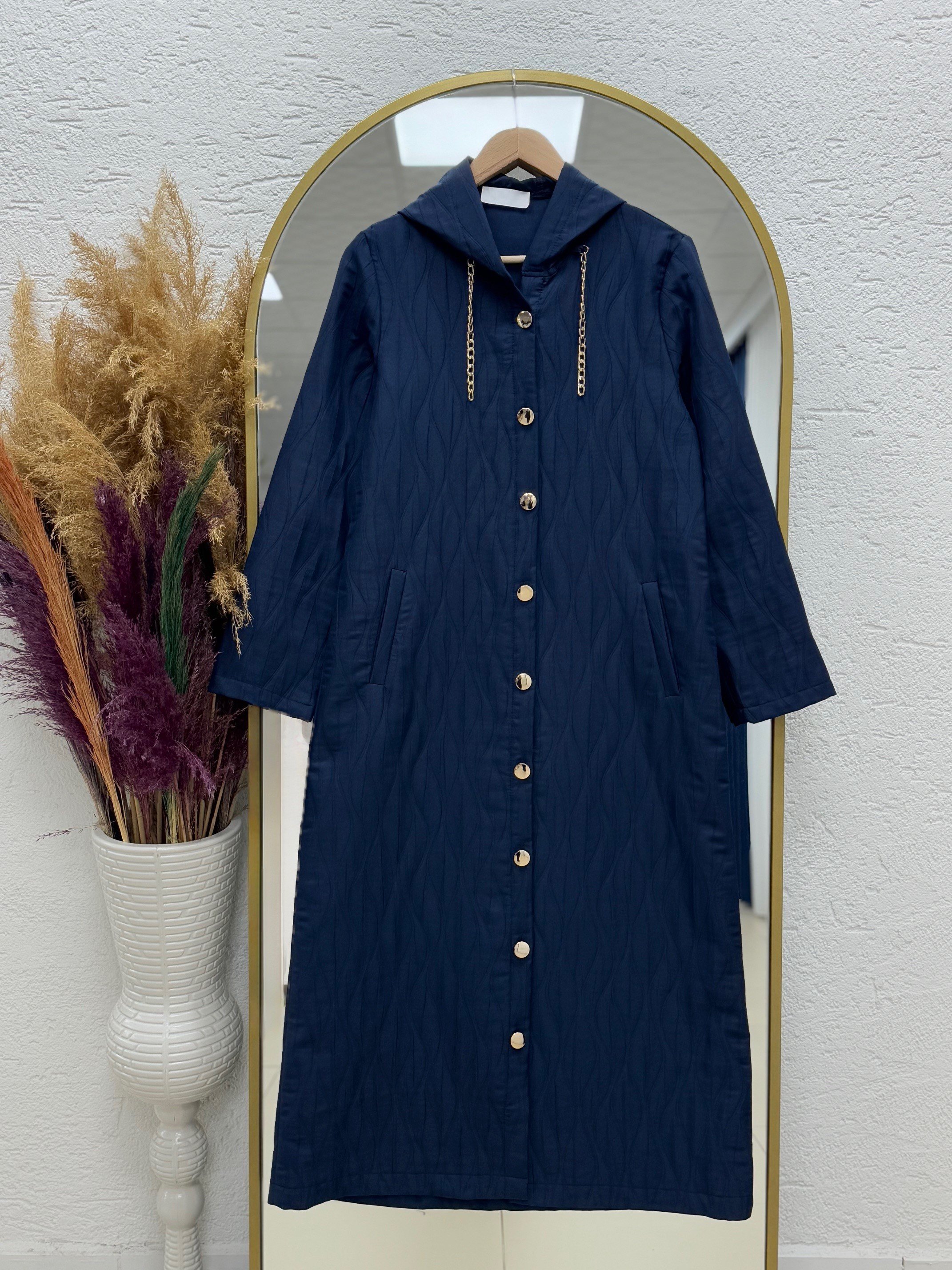 Celedra Kapşonlu Kapitone Zincir Detaylı Tam Boy Trenç-ZŞ6010 Lacivert