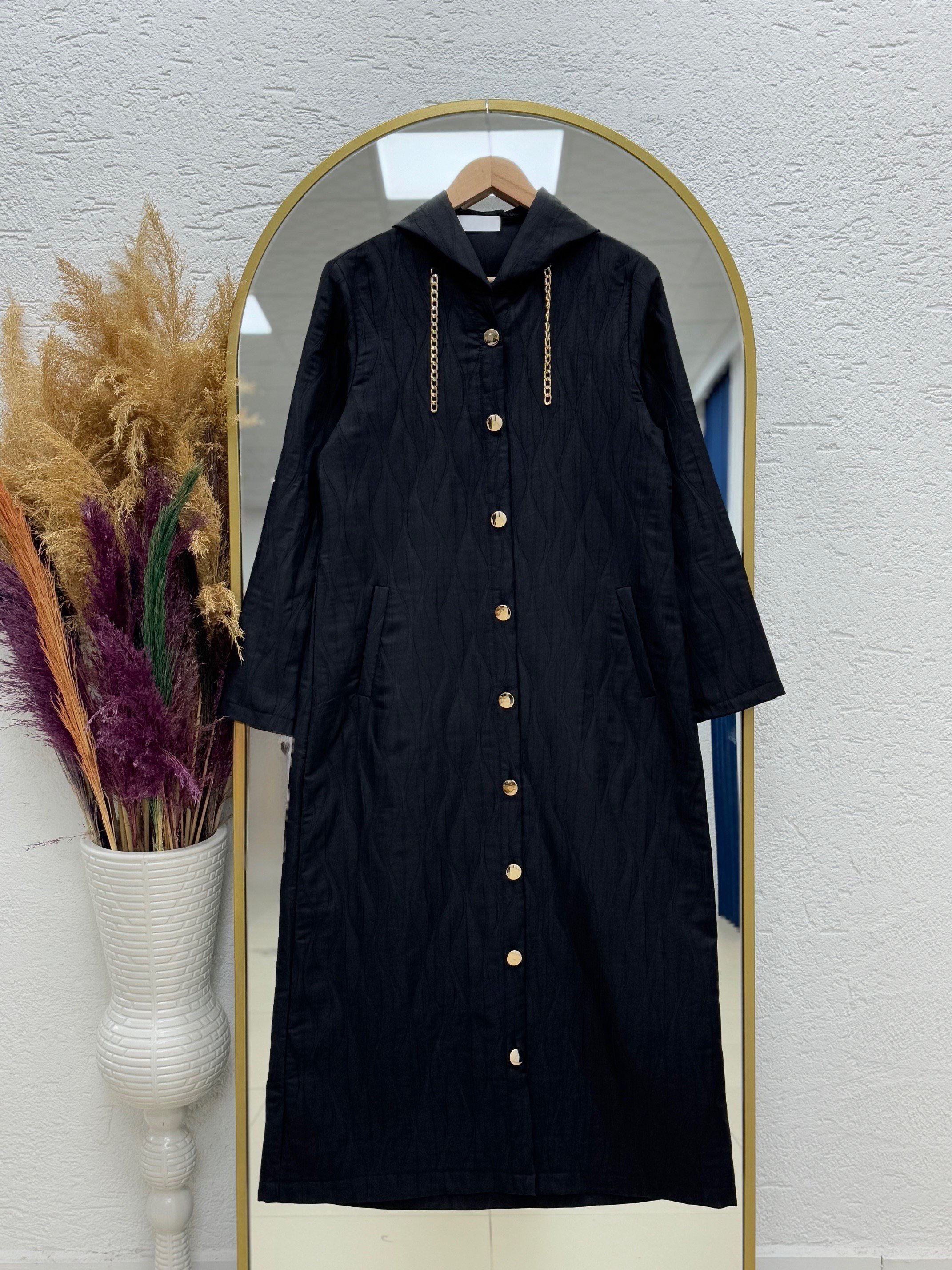 Celedra Kapşonlu Kapitone Zincir Detaylı Tam Boy Trenç-ZŞ6010 Siyah
