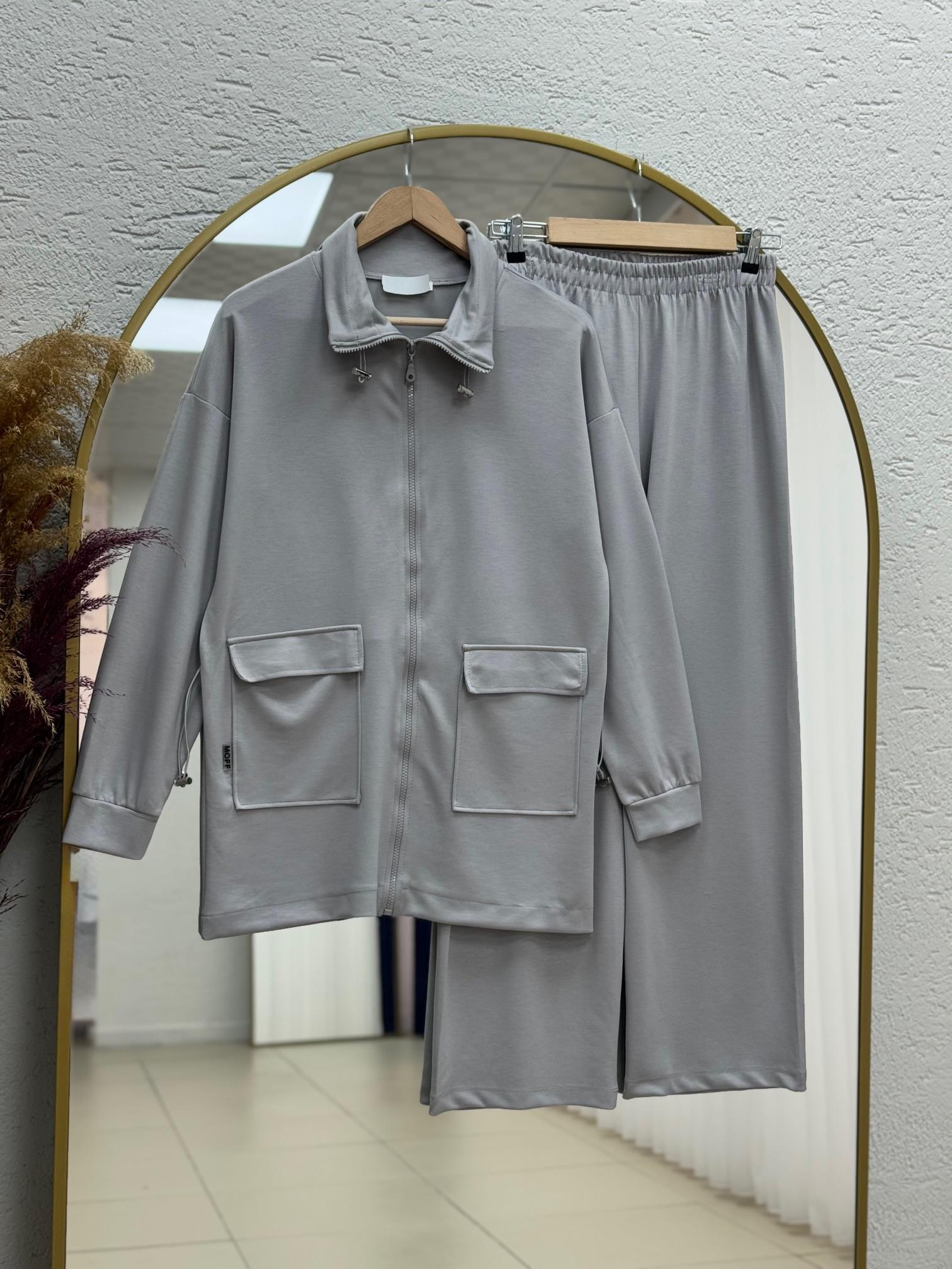 Celera Yanları Sıkmalı Çift Cepli Fermuarlı Pantolonlu Takım-MF1817 Gri