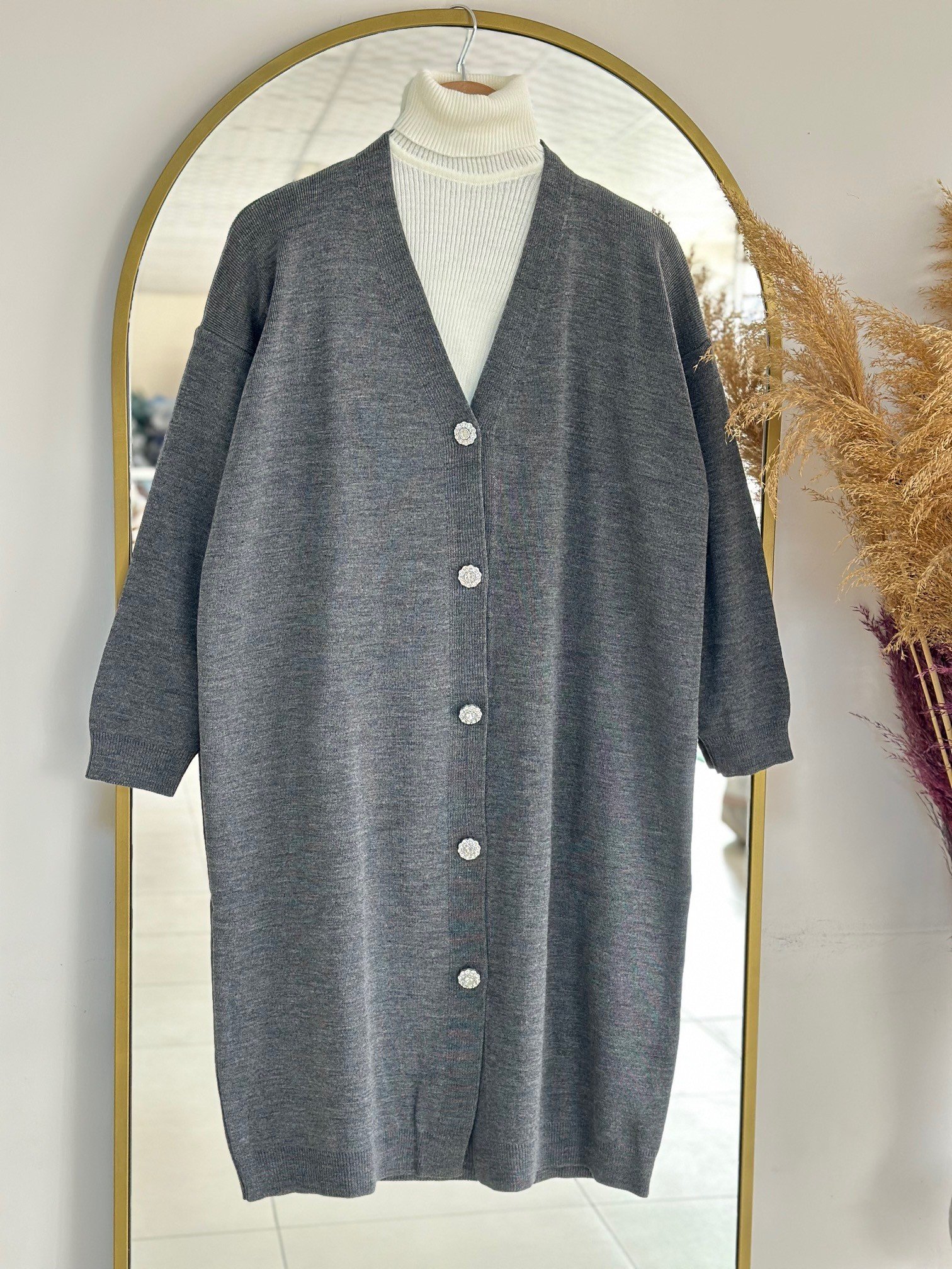 Defne Papatya Düğmeli Uzun Hırka-Zİ6184 Antrasit