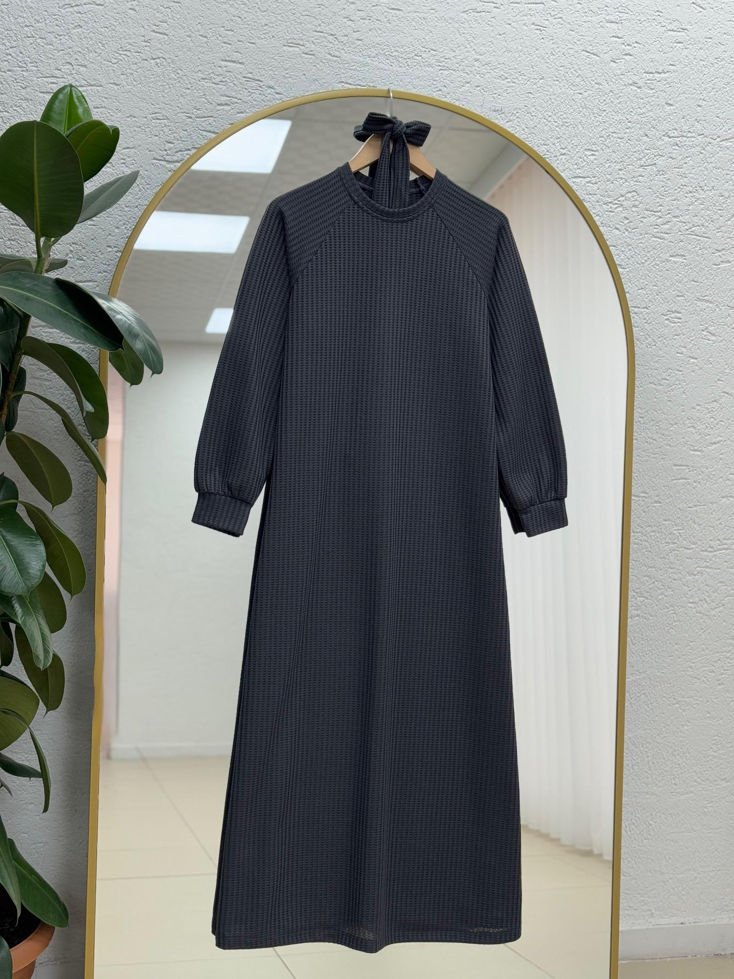 Delella Reglan Kol Kemerli Gofre Elbise-MF1693 Antrasit