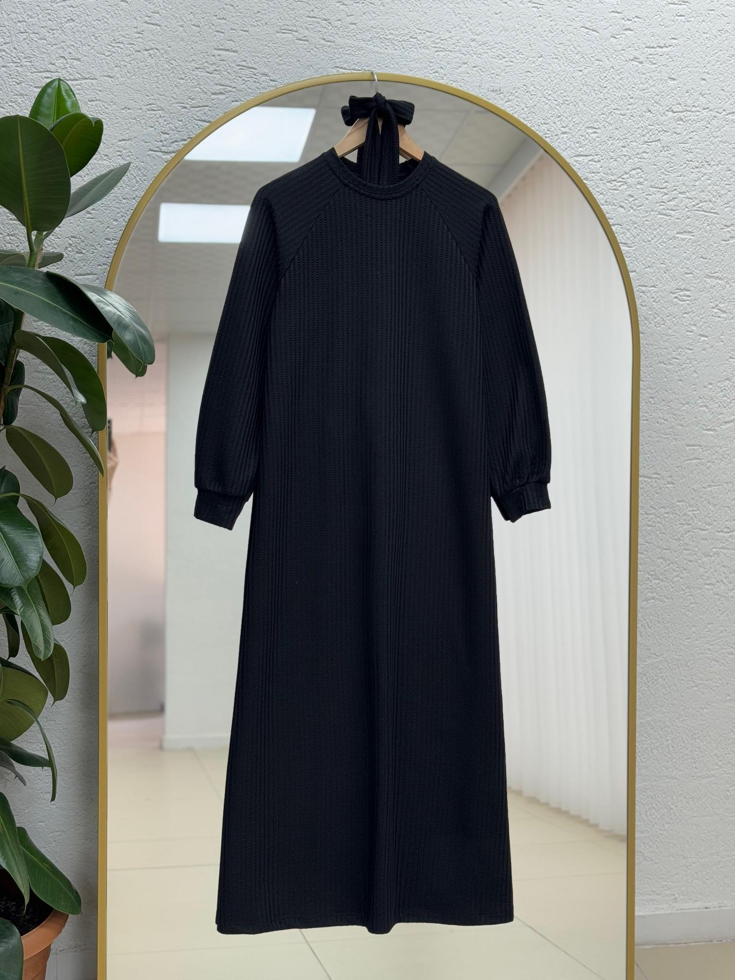 Delella Reglan Kol Kemerli Gofre Elbise-MF1693 Siyah