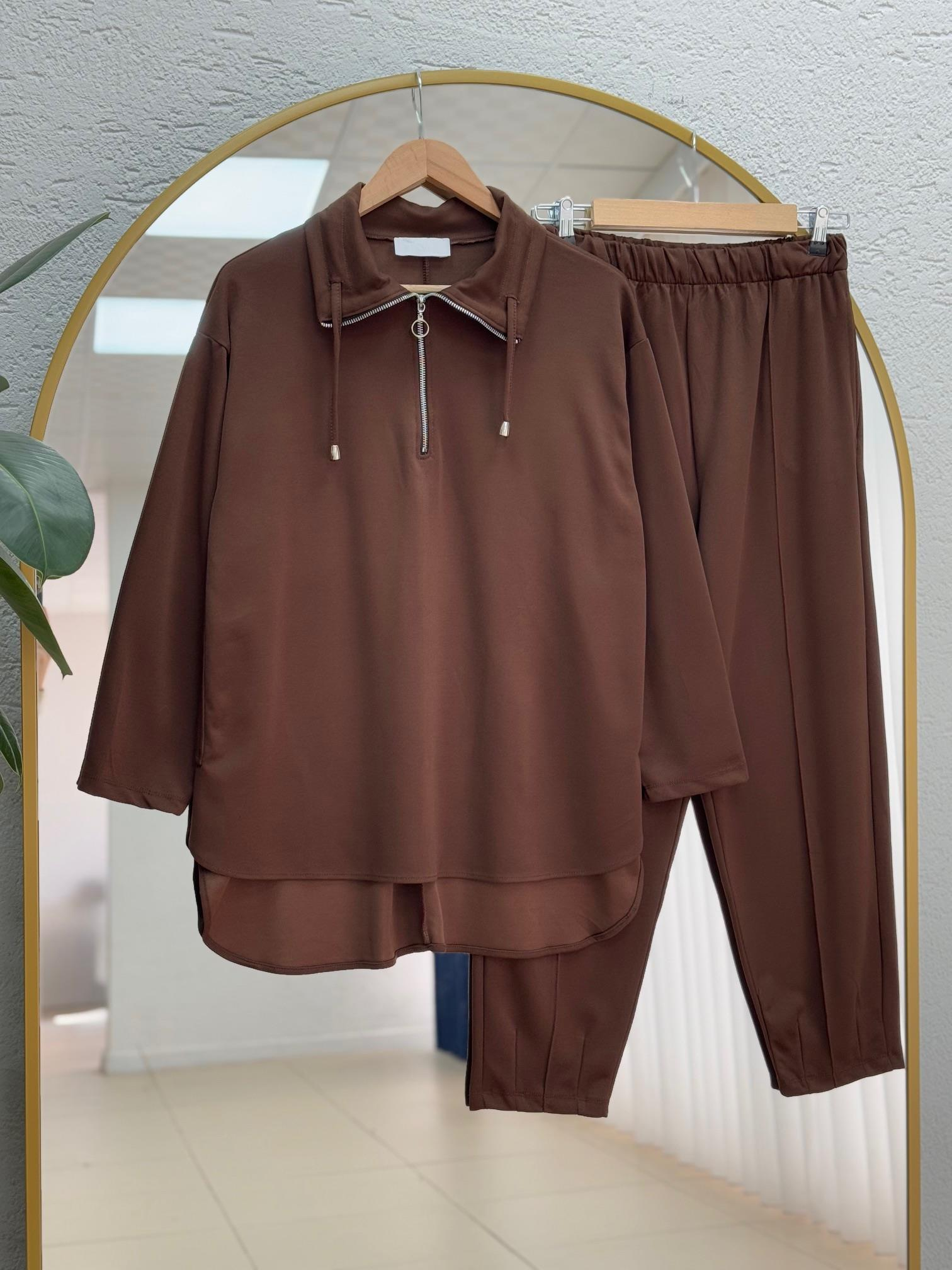 Delina Yarım Fermuarlı Yakalı Salaş Takım-NA3424 Kahve