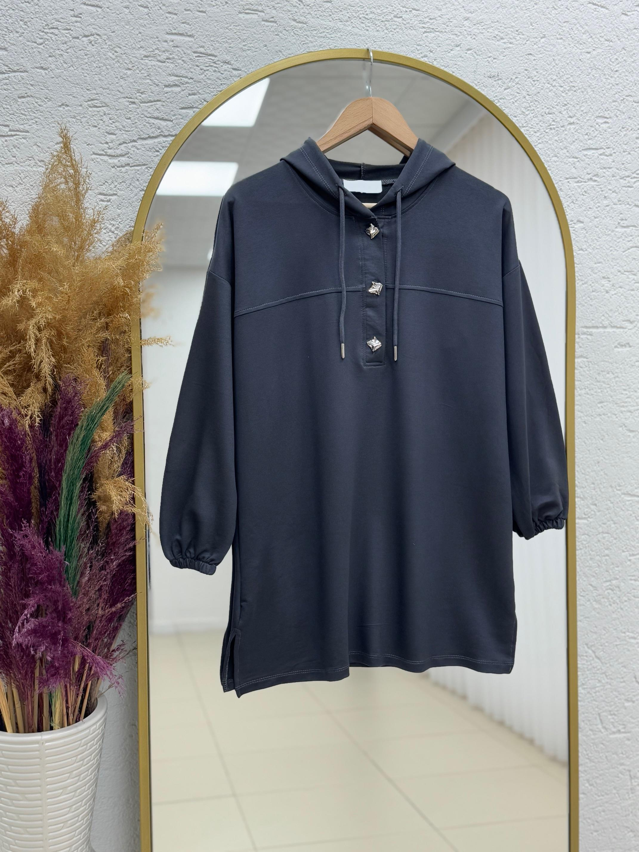 Doronia Önü Üç Yıldız Düğmeli Robalı Kapşonlu İki İp Sweat-ZN4777 Antrasit