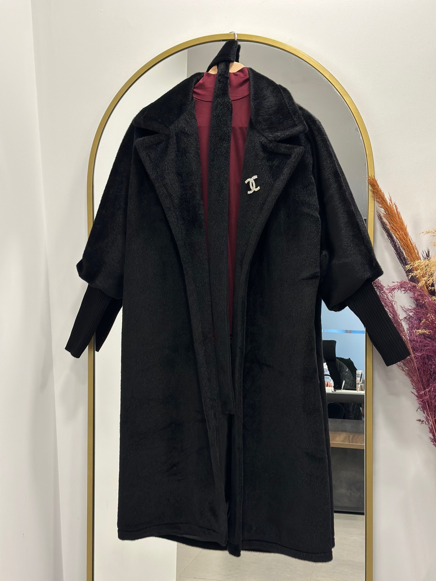 Elvin Kol Ucu Lastikli Balon Kol Kuşaklı Kaşe Kaban-BR7874 Siyah
