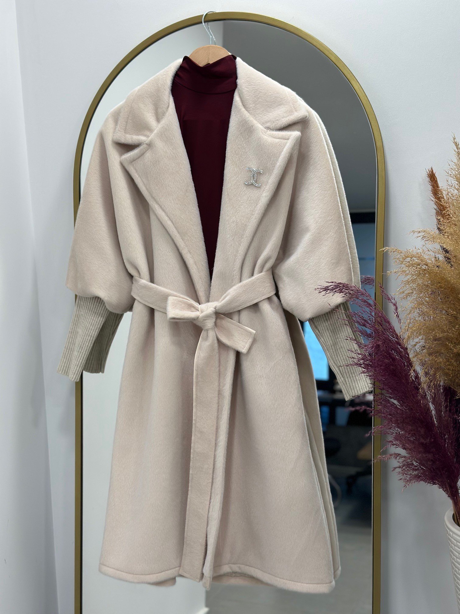 Elvin Kol Ucu Lastikli Balon Kol Kuşaklı Kaşe Kaban-BR7874 Taş