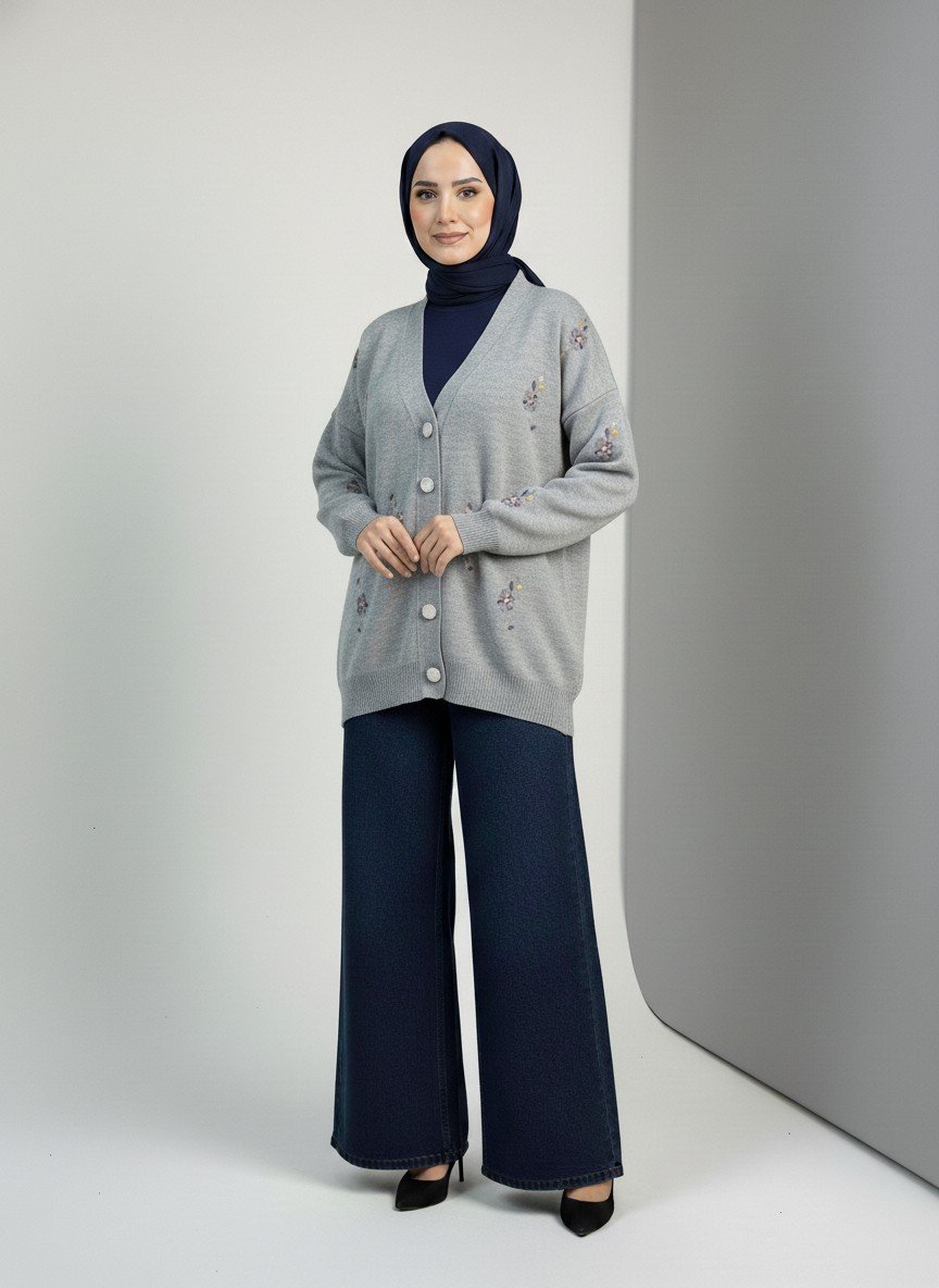 Ferenya Oyuk Düğmeli Çiçek Nakışlı Hırka-Zİ6248 Gri