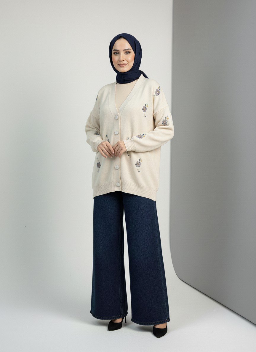 Ferenya Oyuk Düğmeli Çiçek Nakışlı Hırka-Zİ6248 Taş