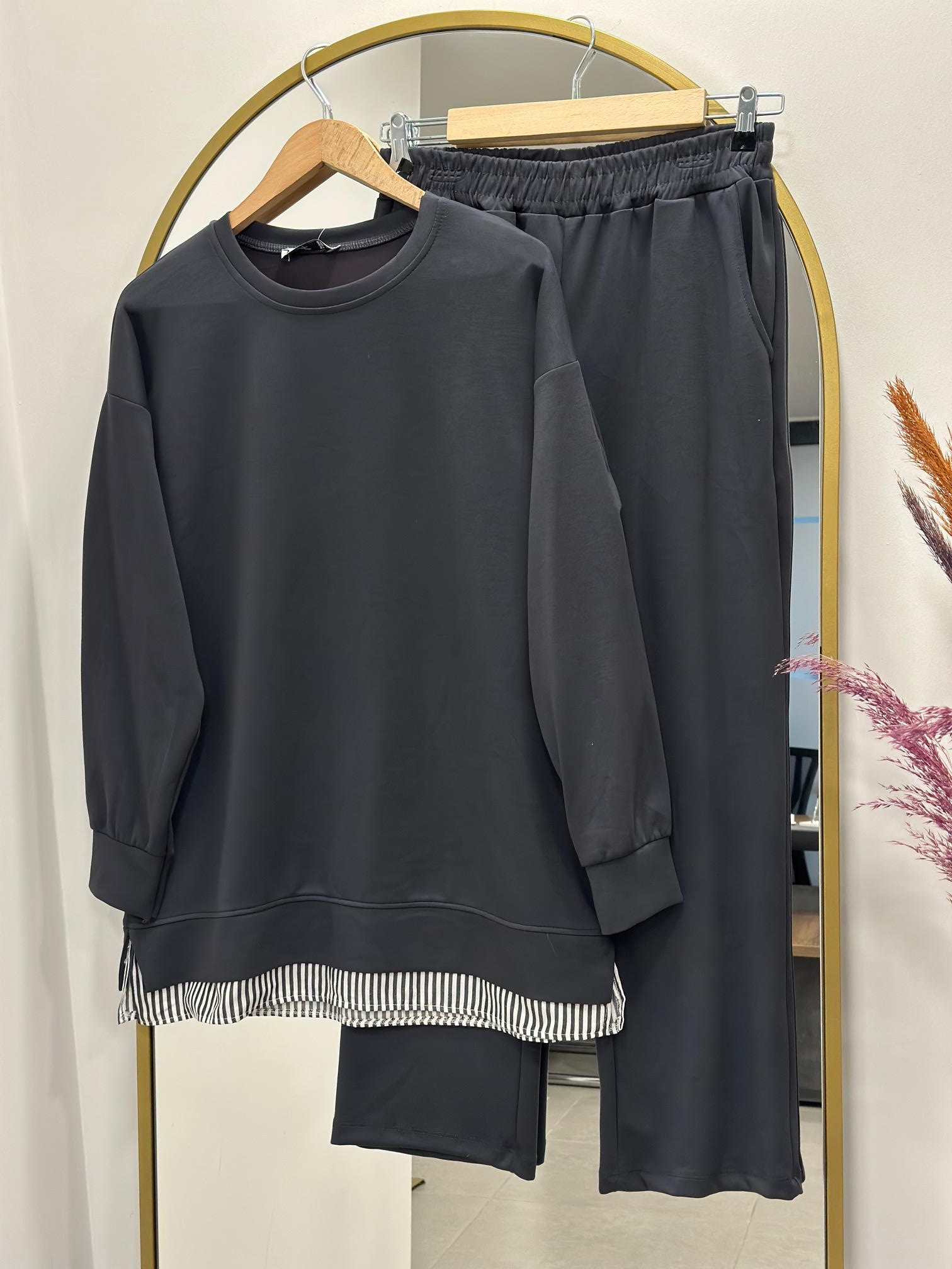 Gamze Altı Çizgili Pantolonlu Takım-MF1741 Antrasit