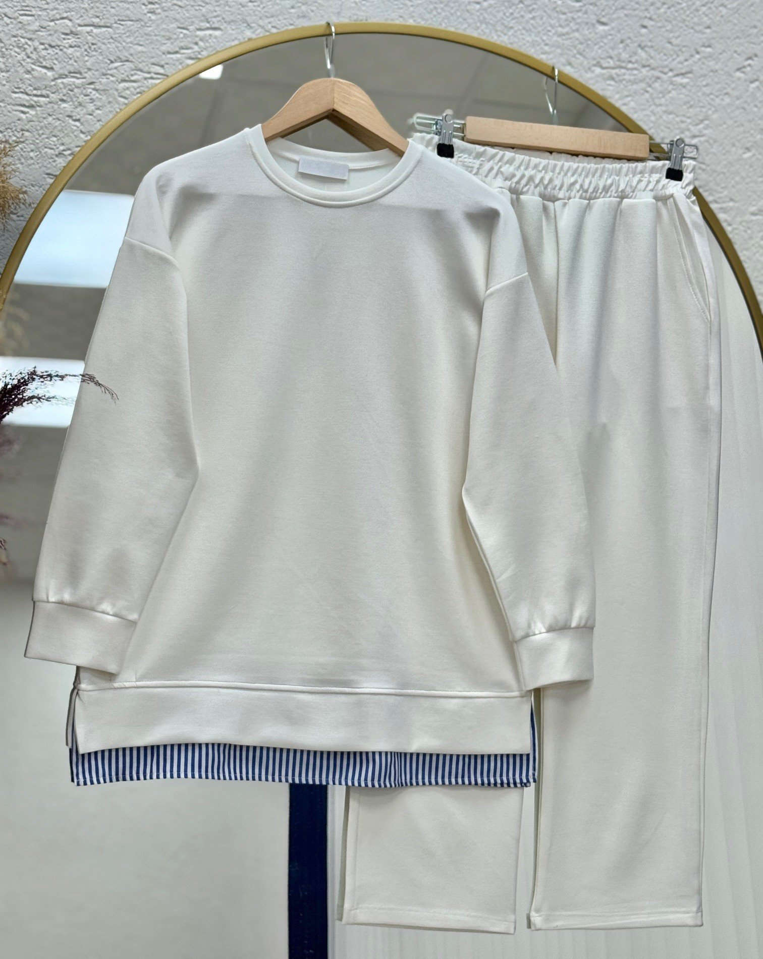 Gamze Altı Çizgili Pantolonlu Takım-MF1741 Ekru