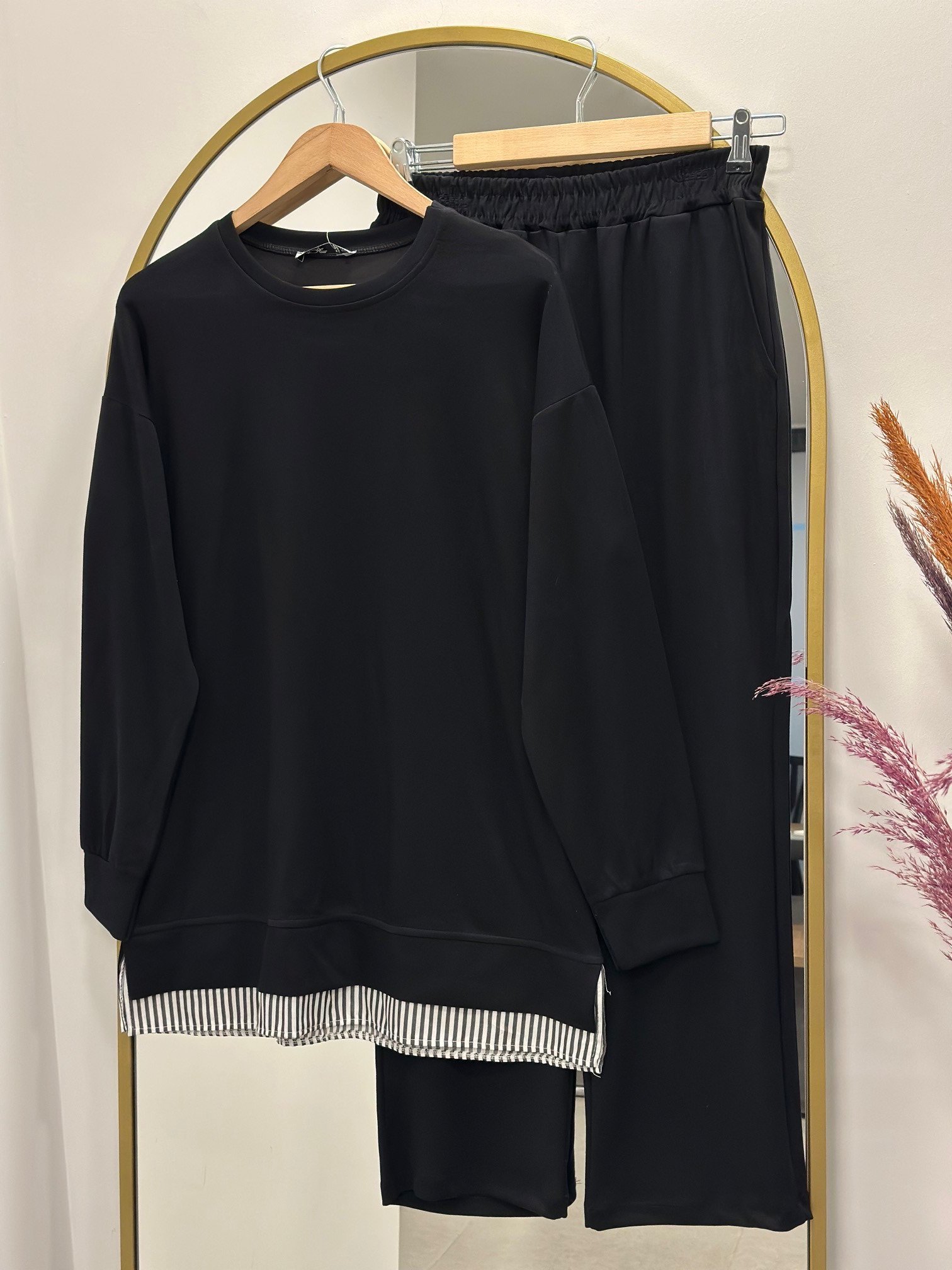 Gamze Altı Çizgili Pantolonlu Takım-MF1741 Siyah