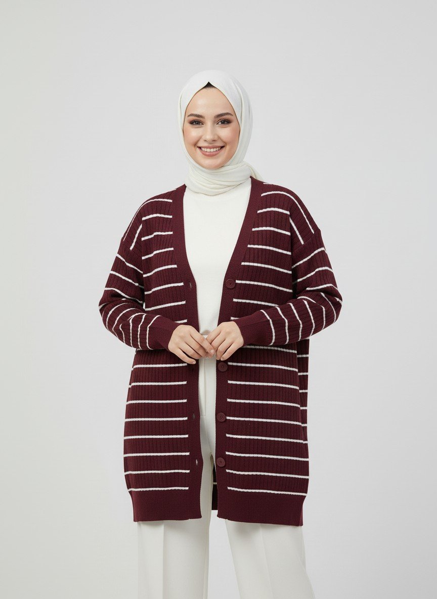 Gavonia Şeritli İri Düğmeli Uzun Triko Hırka-Zİ6137 Bordo