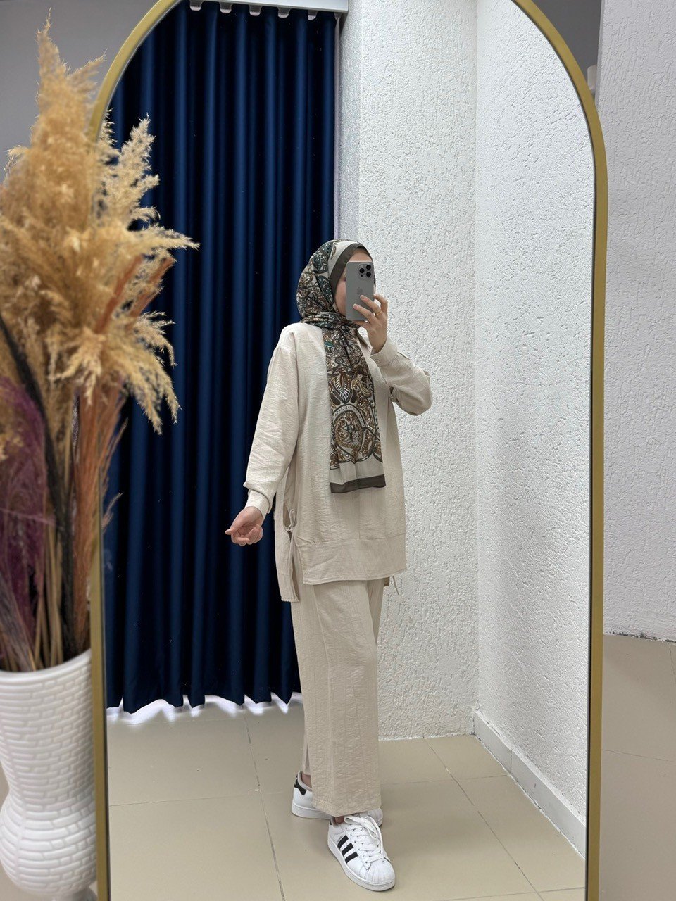 Glarus Yanları İpli Düğmeli Kırışık Çilek Takım-MF458 Taş