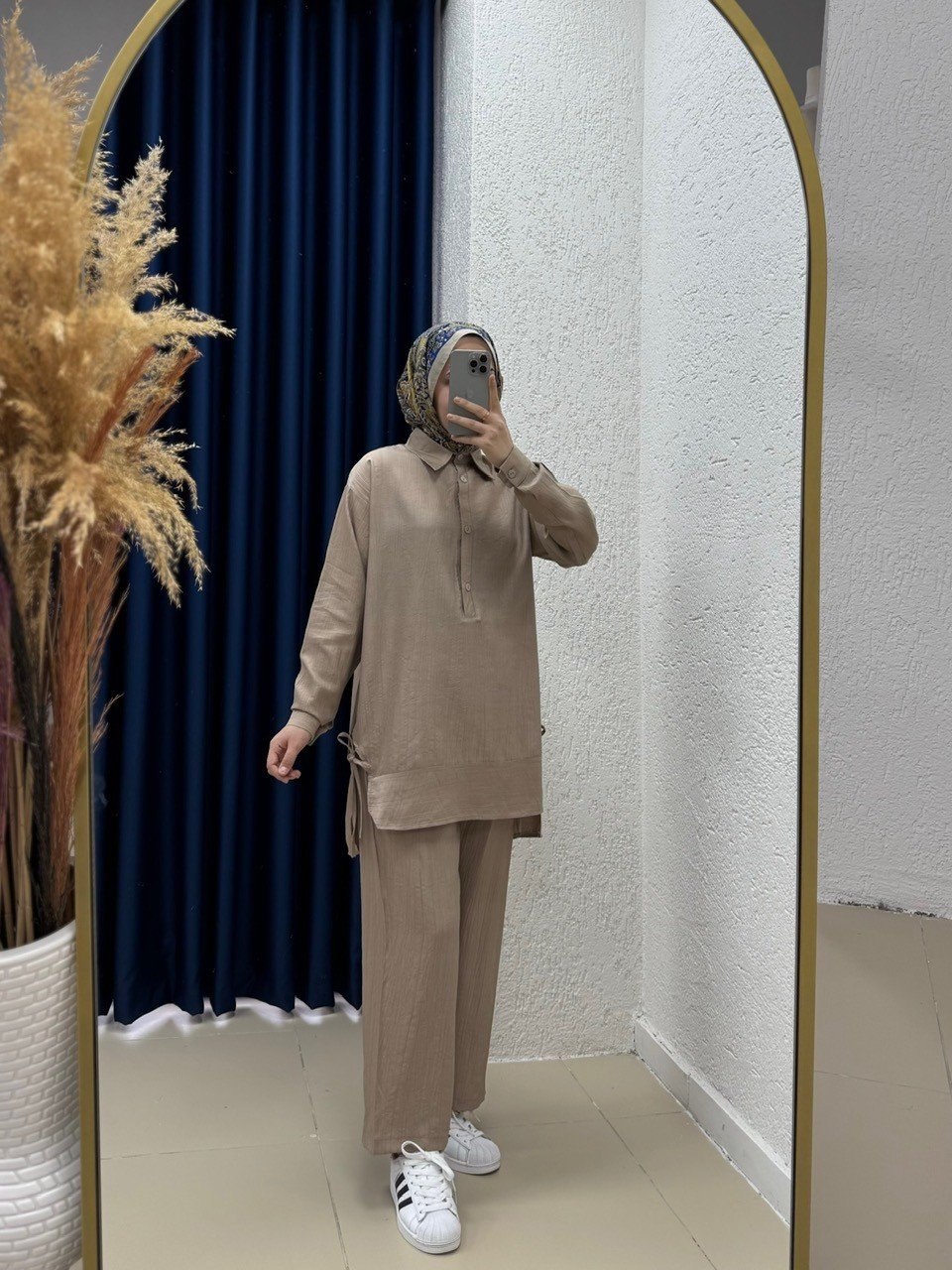 Glarus Yanları İpli Düğmeli Kırışık Çilek Takım-MF458 Vizon