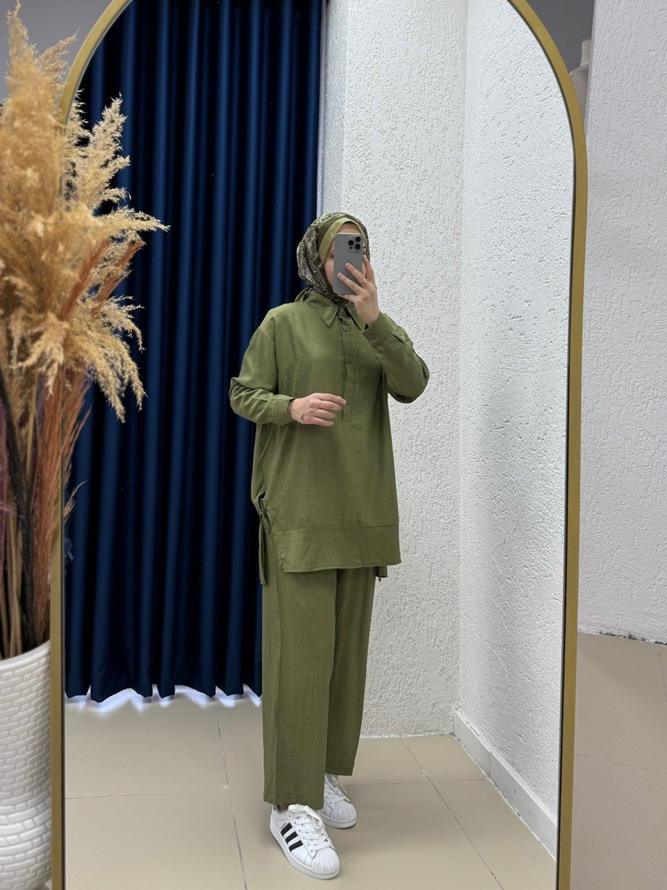 Glarus Yanları İpli Düğmeli Kırışık Çilek Takım-MF458 Yeşil