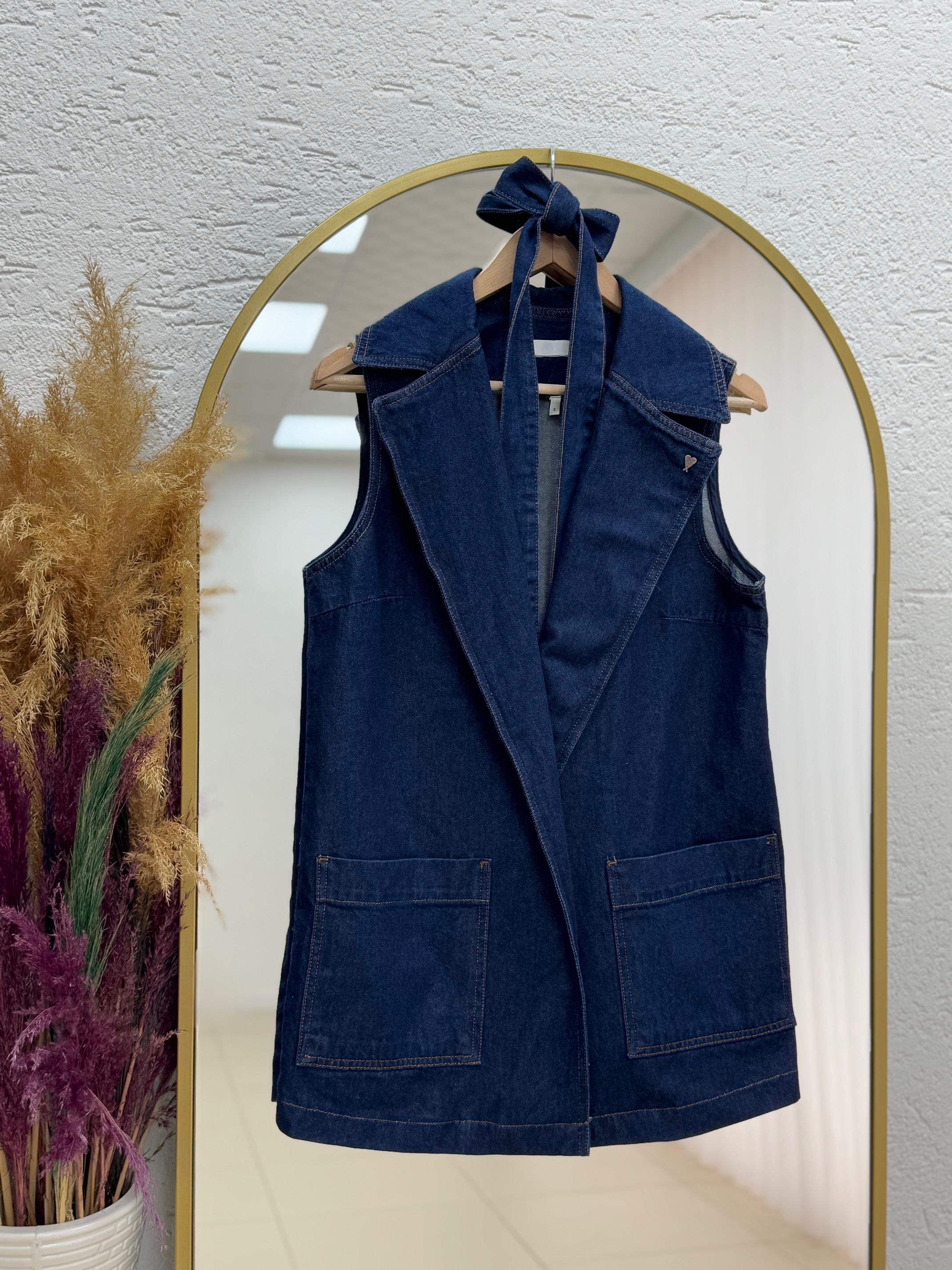 Halesia Kuşaklı Kruvaze Yaka Kot Yelek-XE6137 Kot Rengi
