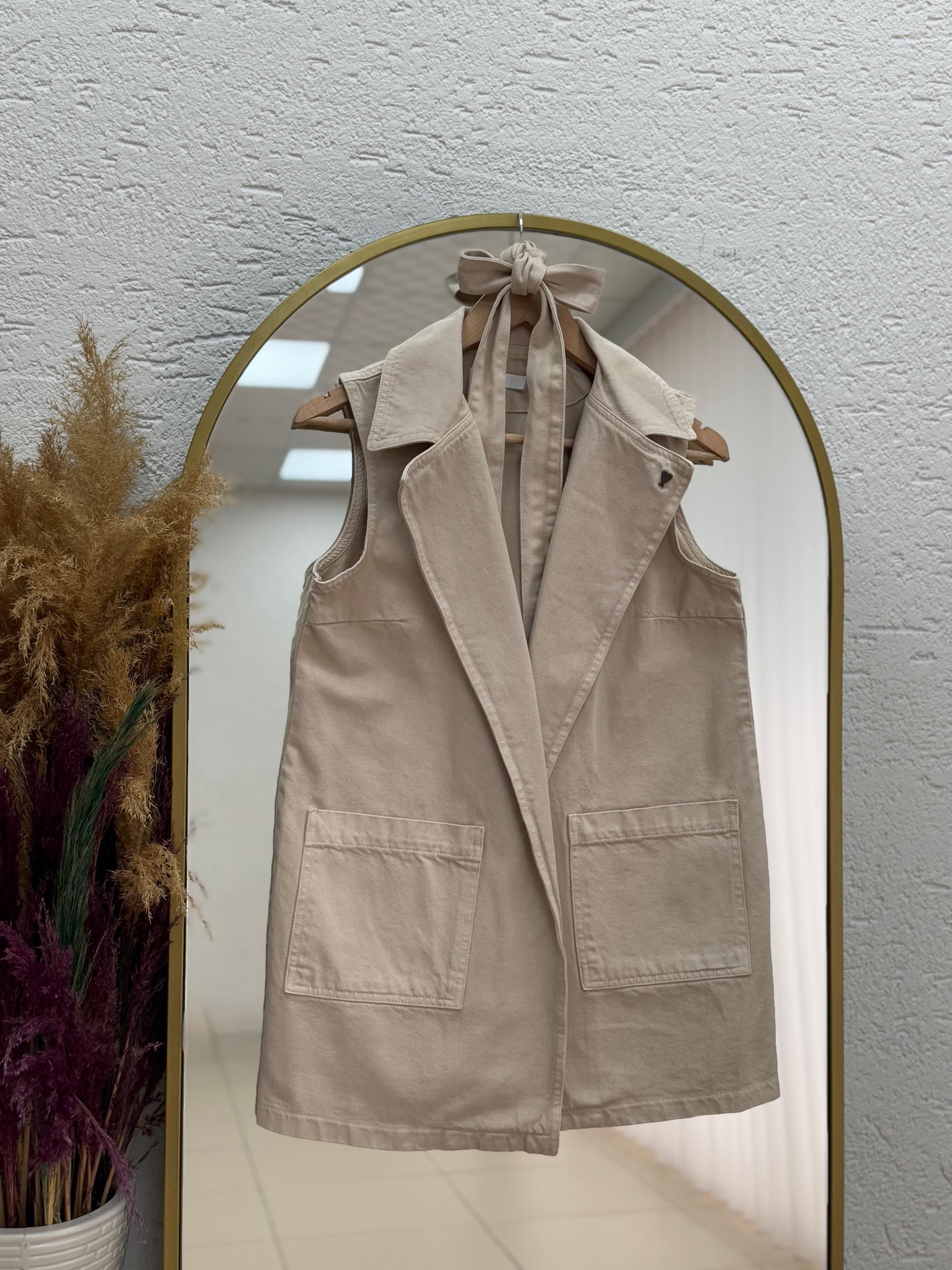 Halesia Kuşaklı Kruvaze Yaka Kot Yelek-XE6137 Taş