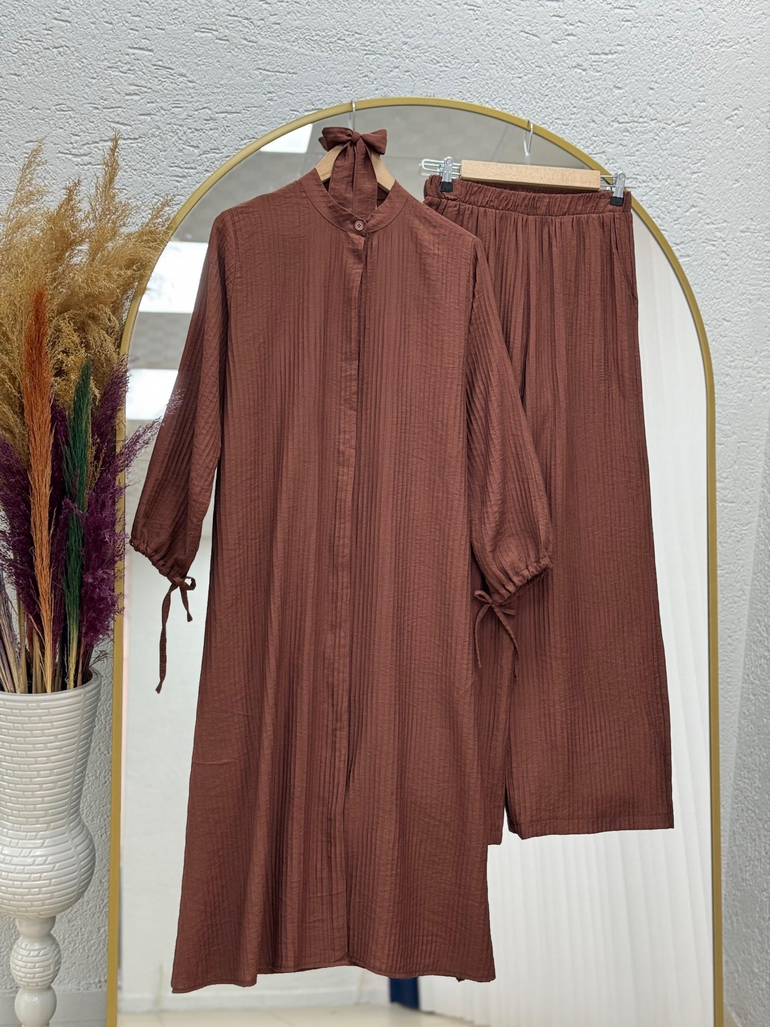 Halona Bilekleri İpli Gizli Patlı Tuniği Uzun Pantolonlu Takım-EK592.3 Kahve