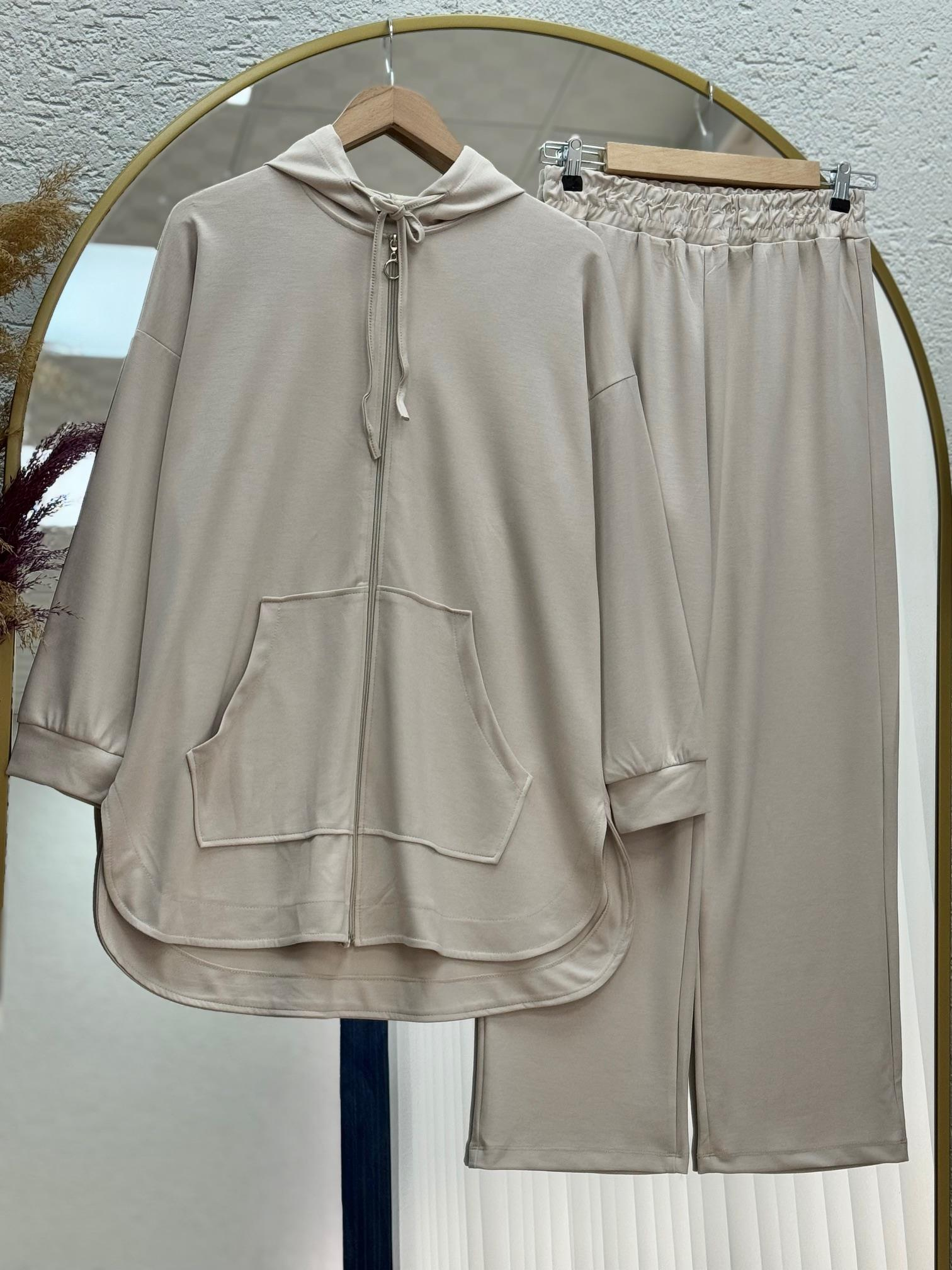 Hande Kanguru Cepli Fermuarlı Pantolonlu Takım-MF1746 Bej