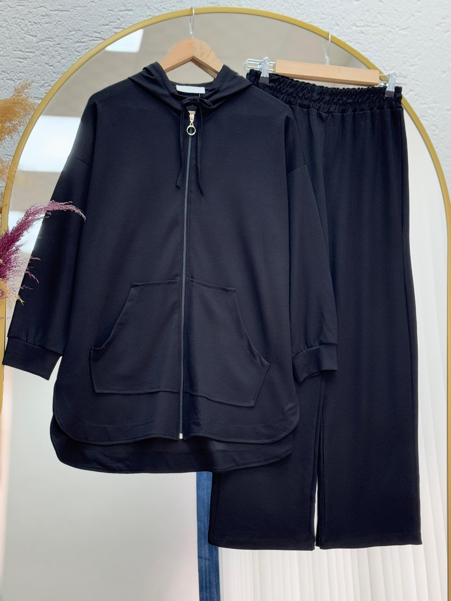Hande Kanguru Cepli Fermuarlı Pantolonlu Takım-MF1746 Siyah