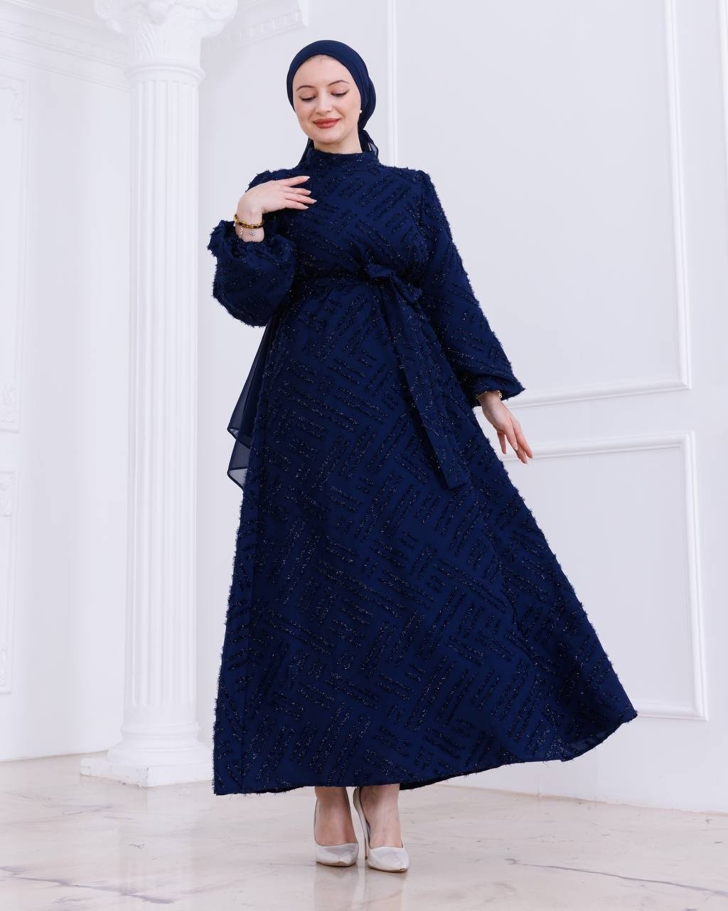 İmran İşlemeli Ve Simli Kuşaklı Elbise-PA9564 Lacivert