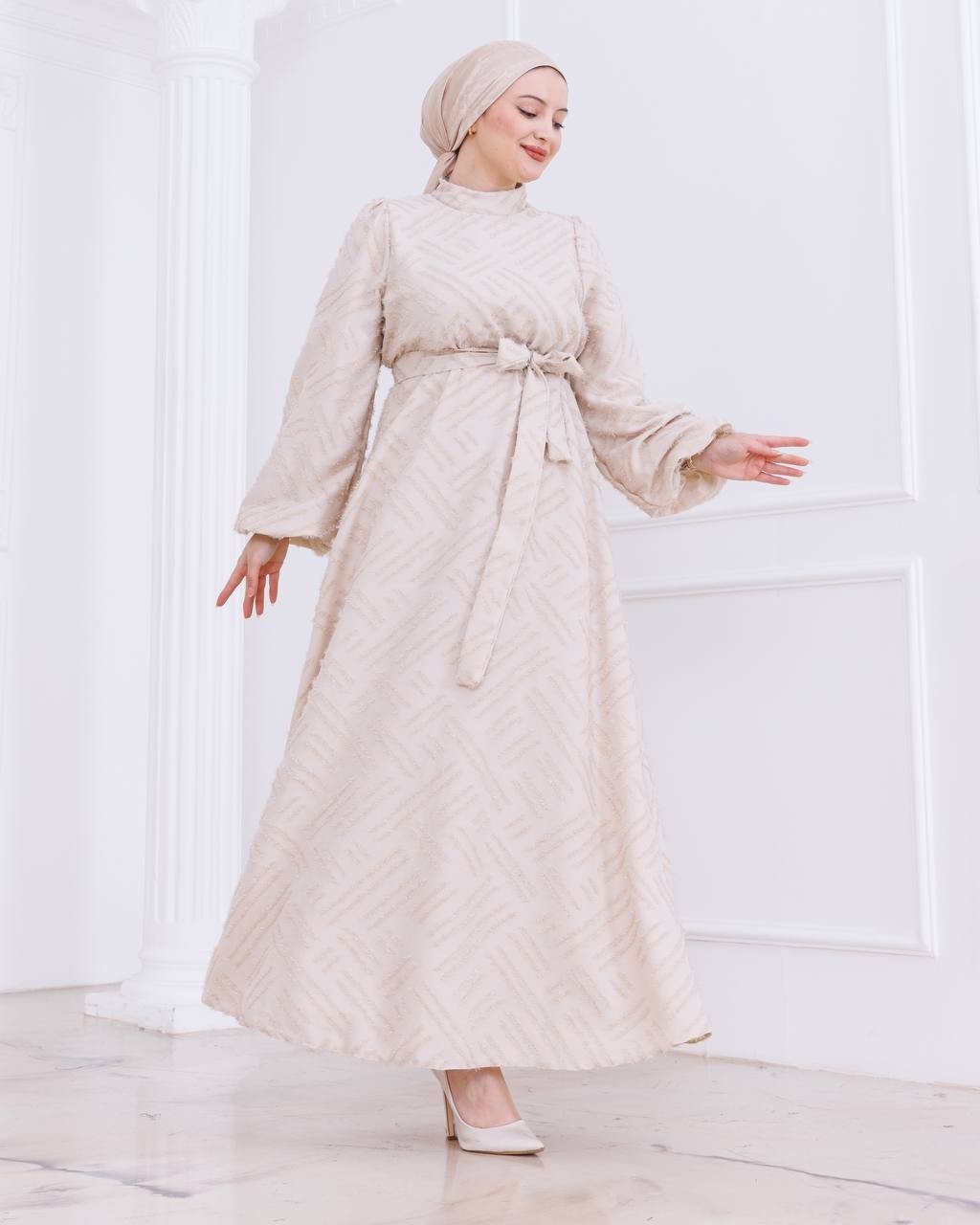 İmran İşlemeli Ve Simli Kuşaklı Elbise-PA9564 Taş