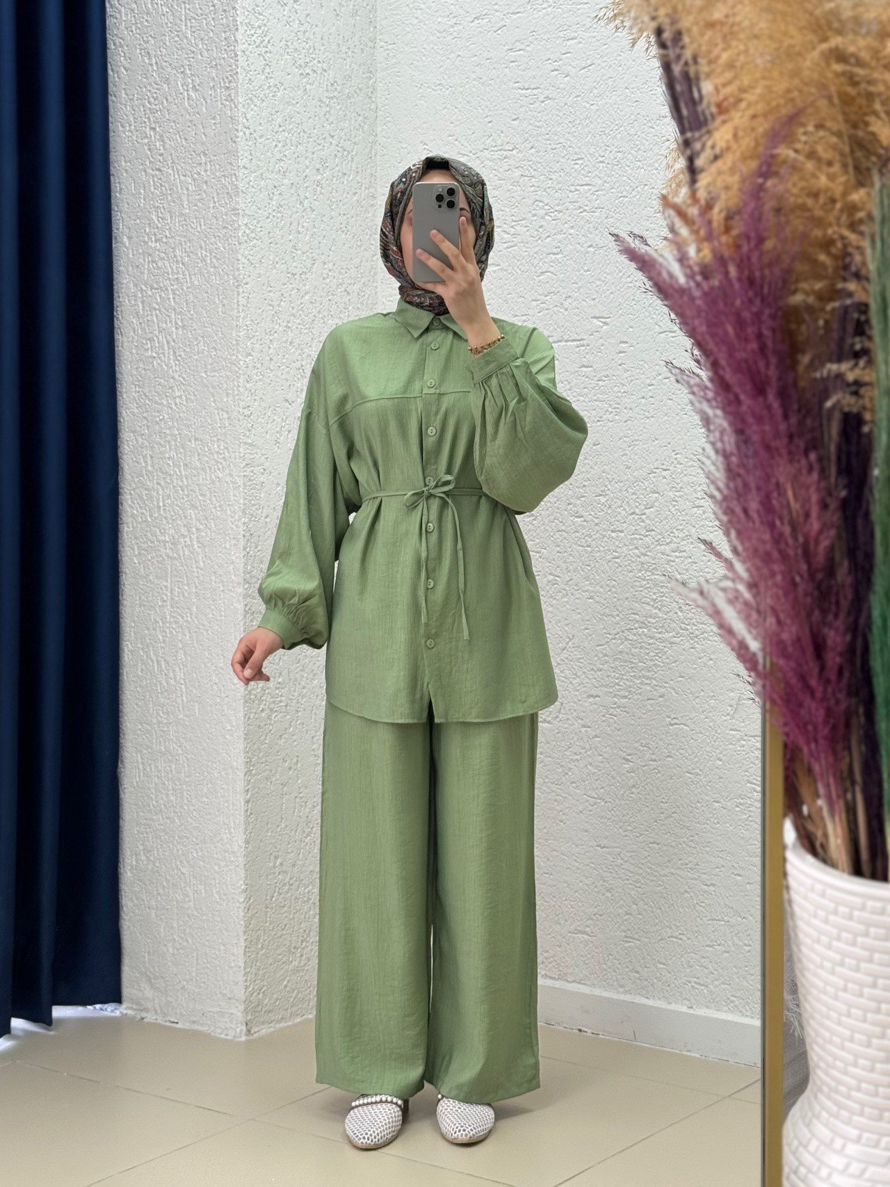 Kadın Tesettür Pantolonlu Takım/Melira Önü Pervazlı Biyeli Çilek Pantolonlu Takım-MF561 Çağla Yeşili
